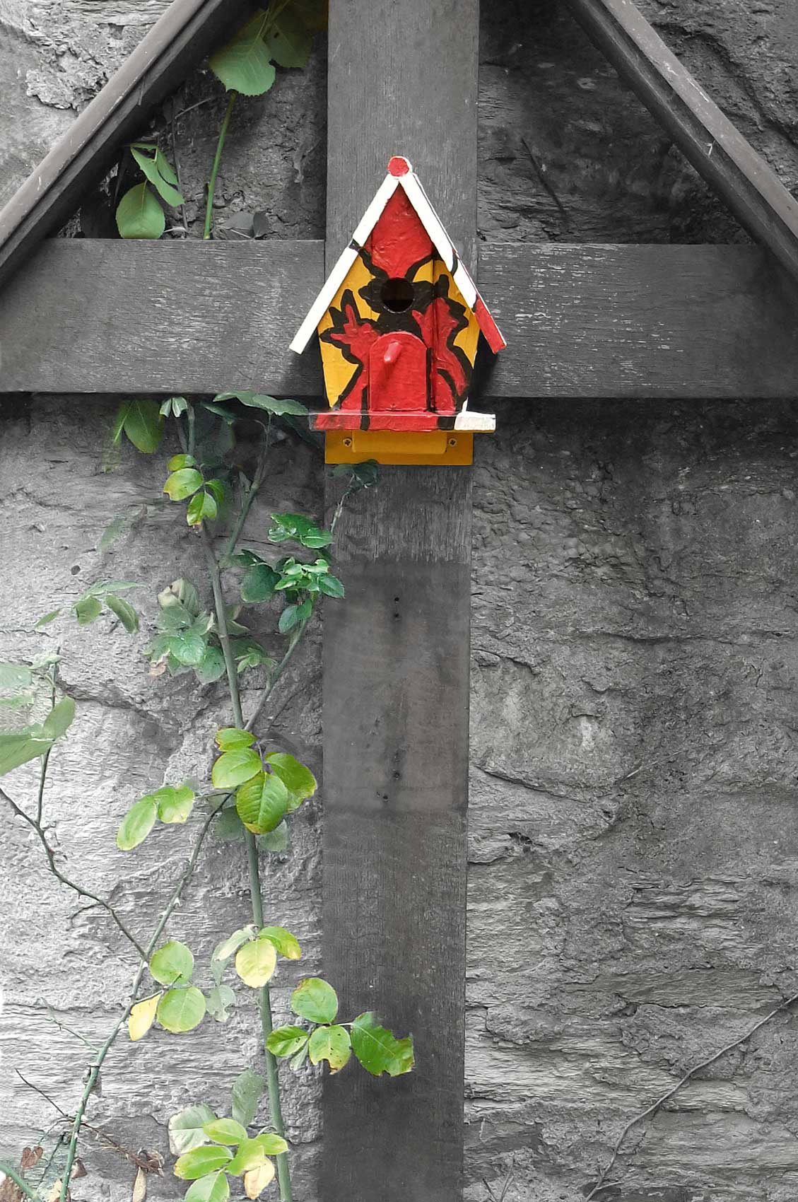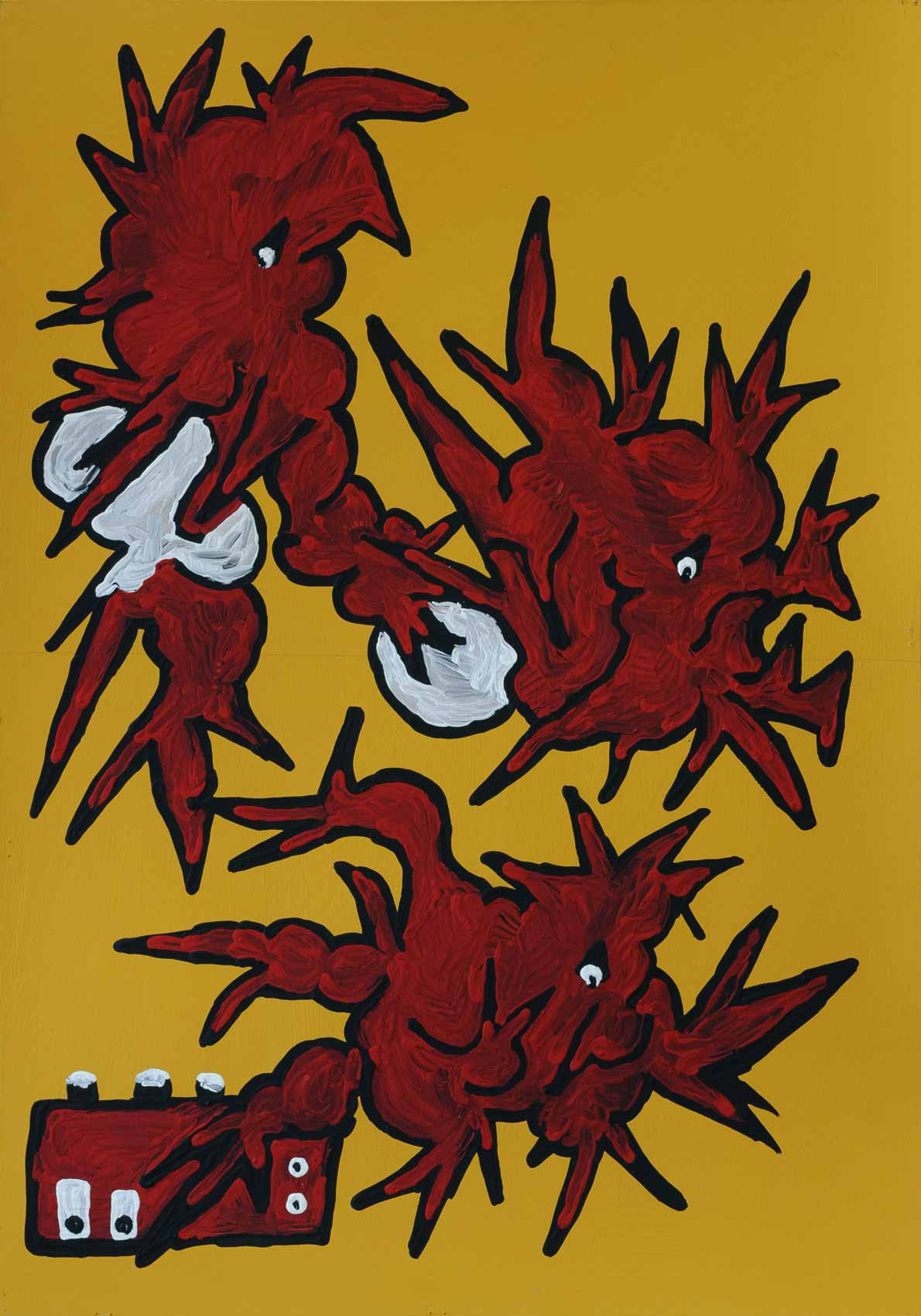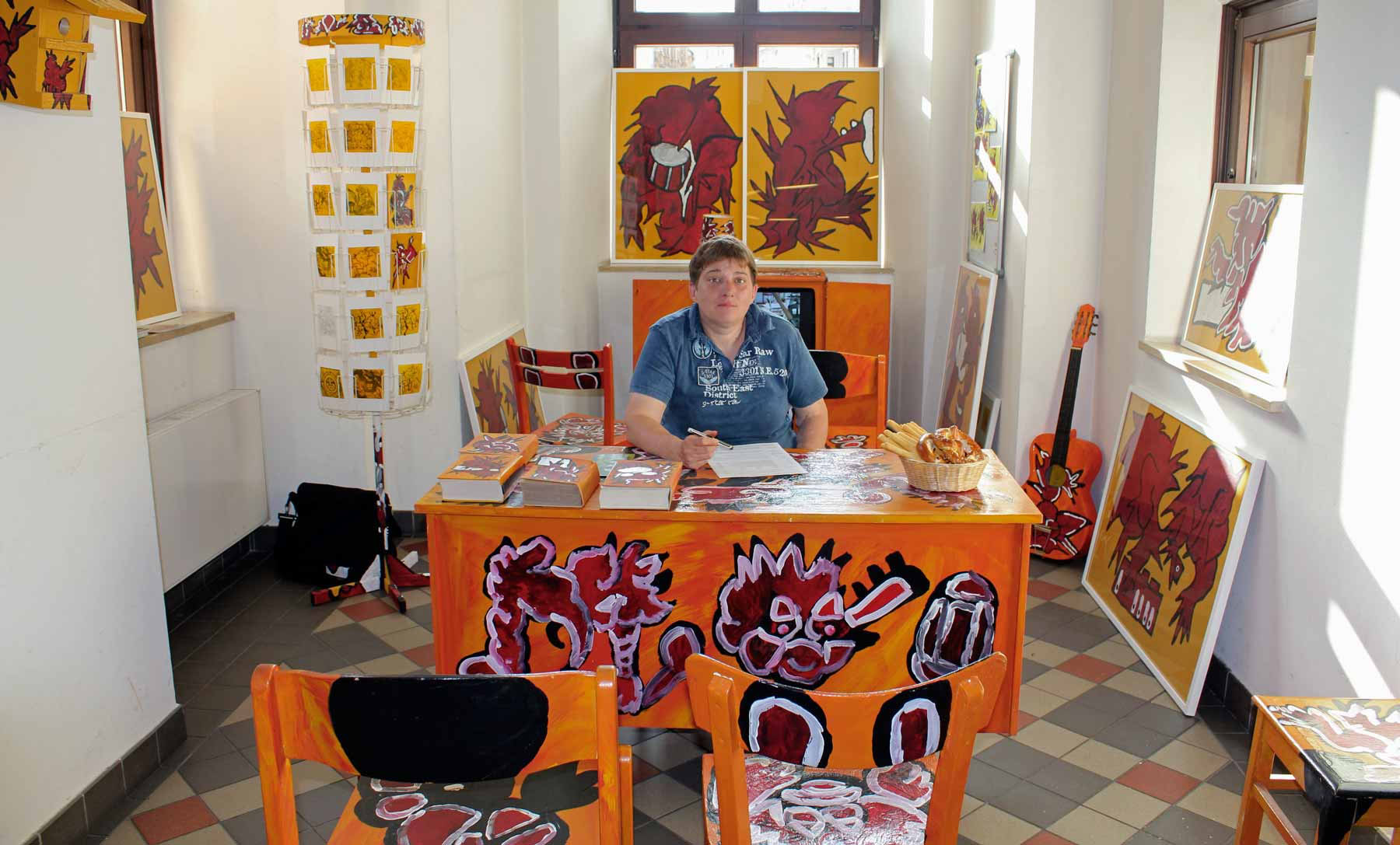 Angesichts jener alten Verzweiflung erscheinen die Bilder von Angie Beyer heiter, quirlig, voller Lebenselan. Menschenähnlich, in Aktion und Interaktion, wie in einem Comicstrip sind ihre Gestalten. Und bunt. Schwarz, Gold, Rot hilft dem Maler aus der Not. Die etwas despektierliche Äußerung könnte im Falle von Angie Beyer eine ganz neue Bedeutung bekommen. Schnell sind sie gemalt, roh, voller Ungeduld: auf Tischen, Stühlen, Schränken, Musikinstrumenten und natürlich Vogelhäuschen. Man findet sie auf Buchdeckeln und als Drucke. Sie laden dazu ein, Geschichten zu erspüren, zu erfinden und weiterzuerzählen.