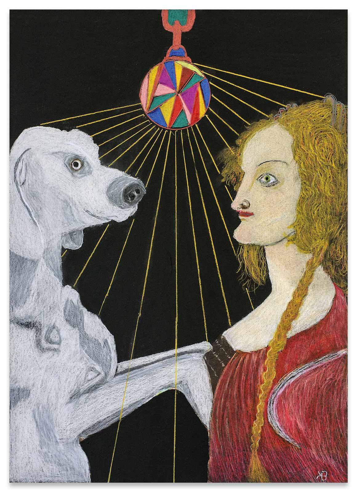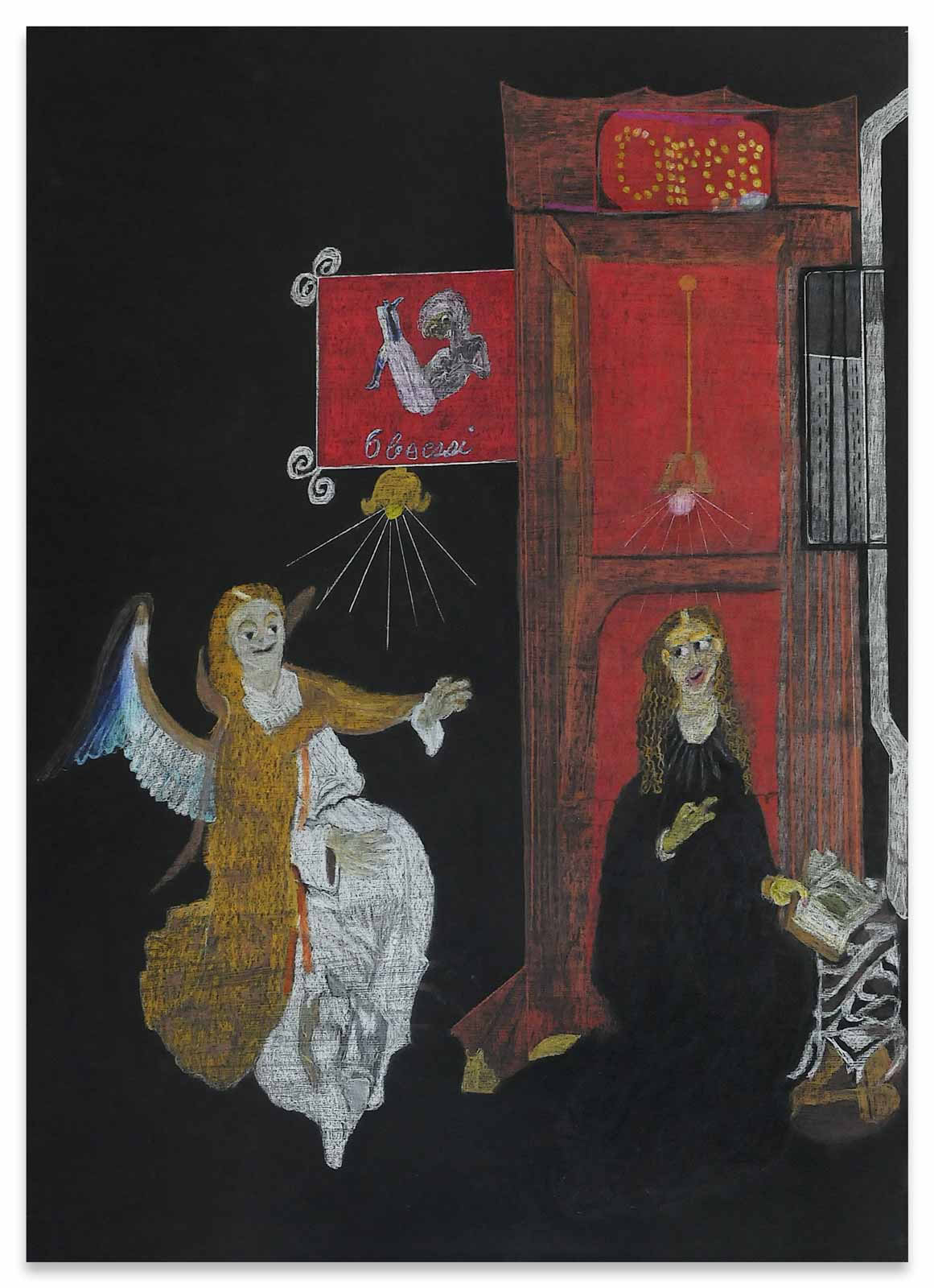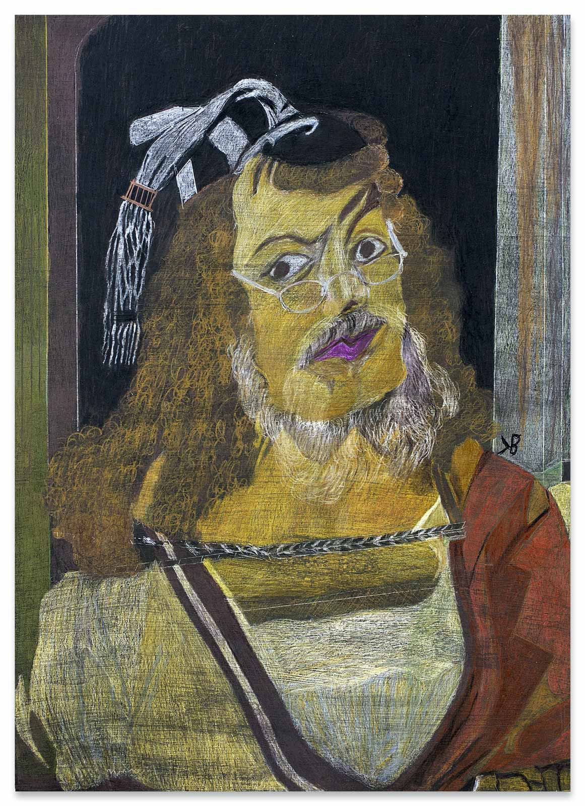 Sein Vater war Polizist in Litauen, „auf der Flucht erschossen“, seine Mutter während der Nachkriegswirren mit vier Kindern vollkommen überfordert. Bruno Krauledies kam erst ins Heim, dann in eine Gastfamilie auf einen Bauernhof. Hier war er der Knecht. Nein, er hatte nicht immer Glück im Leben. Ausbildung zum Schmied, später Gelegenheitsarbeiter, Binnenschiffer, Kranfahrer und schließlich verdiente er sein Geld als Straßenmusikant. Und trotzdem: seinen Humor hat er nicht verloren. Es scheint fast so, als sei er ihm nicht nur in die Augenfalten eingeschrieben, sondern als habe er ihn auch im Zeichenstift verinnerlicht. Bruno Krauledies arbeitet oft nach Motiven aus der Kunstgeschichte. So verlegt er eine Mariä Verkündigung auch schon einmal in den Rotlichtbezirk („Open“, 2012), oder kombiniert eine Mariendarstellung mit anderen Strahlungsquellen („Madonna mit Mikrowelle“, 2011). Zwölfmal wurde er erfolgreich reanimiert. Seine Nahtoderlebnisse mögen an der Tiefe seiner Bilder einen Anteil haben, die hinter den humoristischen Anspielungen auf ältere und neuere Meisterwerke ebenfalls zu entdecken ist.
