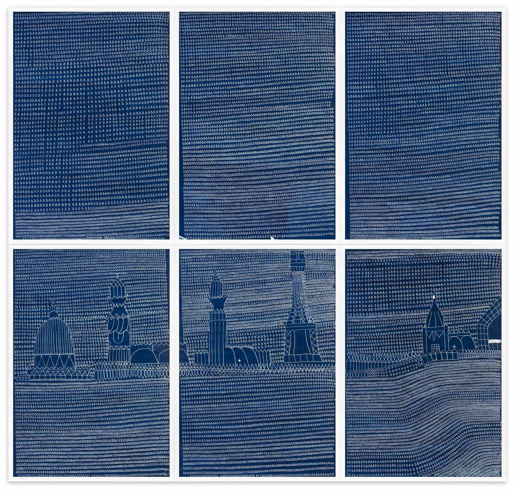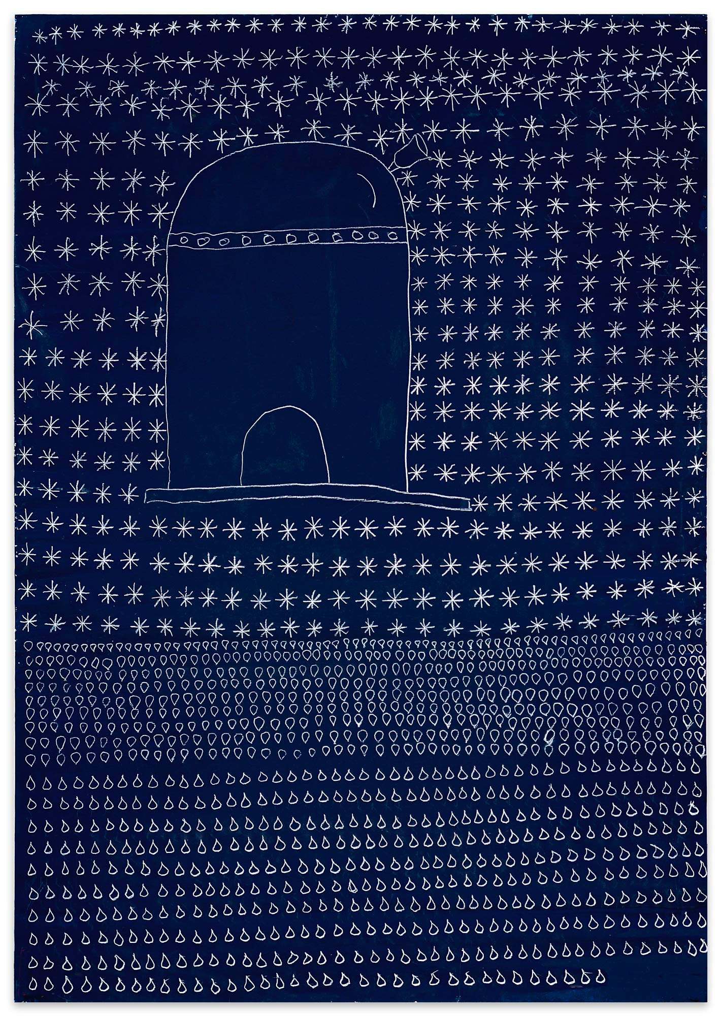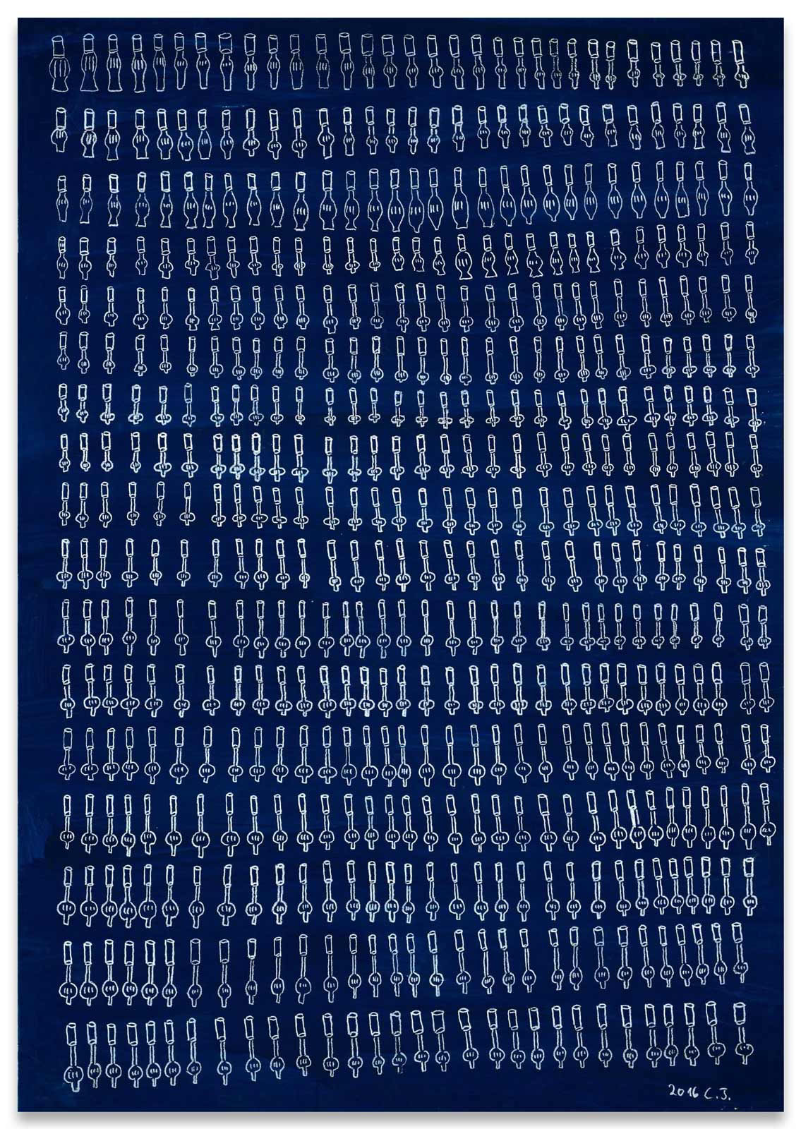 „Es geht eine Träne auf Reisen“ und „Tränen lügen nicht“. Zwei Schlager aus den 1970iger Jahren, die Cornelia Trabhardt wohl vertraut sind. Und in ihrem Falle gingen bereits mehrere 100 000 Tränen im wahrsten Sinne des Wortes auf Reisen. Zu den unterschiedlichsten Ausstellungsorten. 3000 bis 7000 dieser Gebilde finden sich auf einer Arbeit der Größe 100 x 70 Zentimeter. Doch obwohl die wiederkehrende ornamentale Fülle ihrer Tränen wie eine Beschriftung wirkt, sind ihre Bilder nicht tränenselig. Es sind keine Erkundungen im Tränenreich. Sie sind Ausdruck eines tätigen Denkens von Gegenwart. Eine Träne ist eine Träne ist eine Träne. Sie verbergen auch nicht, aus was und wie sie gemacht sind. Ihre Tränen lügen nicht. Wenn sie doch etwas erzählen, dann sprechen sie von Geduld, Beharrungsvermögen und von der schlichten Schönheit der handgemachten und dadurch immer leicht variierenden Wiederholung eines Motivs. Cornelia Trabhardt's Bilder wollen insofern weniger gelesen als schlichtweg betrachtet werden.