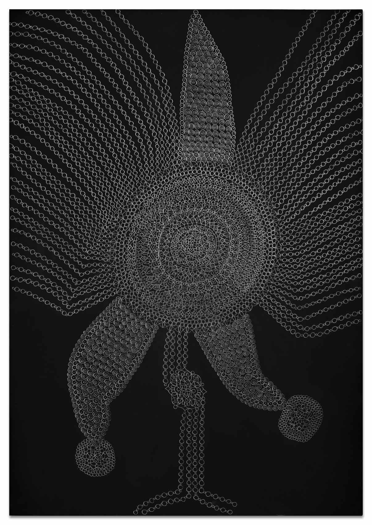 Es beginnt mit einer kleinen abstrakten geometrischen Form auf einer großen ausgespannten Fläche. Ein Kreis, ein Quadrat, eine Raute. Bleistift auf schwarzem Grund. Eine weitere Form kommt hinzu. Oft von mehreren Stellen aus fügen sich Inseln zusammen. Nur die Anschauung gibt zunächst an, was der nächste Arbeitsschritt ist. Aus diesem tätigen Denken von Gegenwart entsteht ein Gebilde und irgendwann im Arbeitsprozess ein Gedanke, eine vage Vision. Ihr spürt Heike Ilkhani weiter nach. Man könnte fast sagen das Ornament verfolgt nun ein Narrativ: "Manchmal hab ich mir gedacht es soll ein Elefant werden und dann ist es doch keiner geworden." Im doppelten Sinne von innen heraus erkundet Heike Ilkhani Formengebilde, die interpretierbar sind. Die Bildtitel geben Hinweise auf ihre eigenen Assoziationen: "Le Qoc", "la Poule" und "die Kinder". Das Silbrige Mineralische des Bleistiftes hebt sich glänzend von der schwarzmonochromen Fläche ab. Ihre Bilder verändern sich abhängig von Lichteinfall und Betrachtungsposition deutlich.