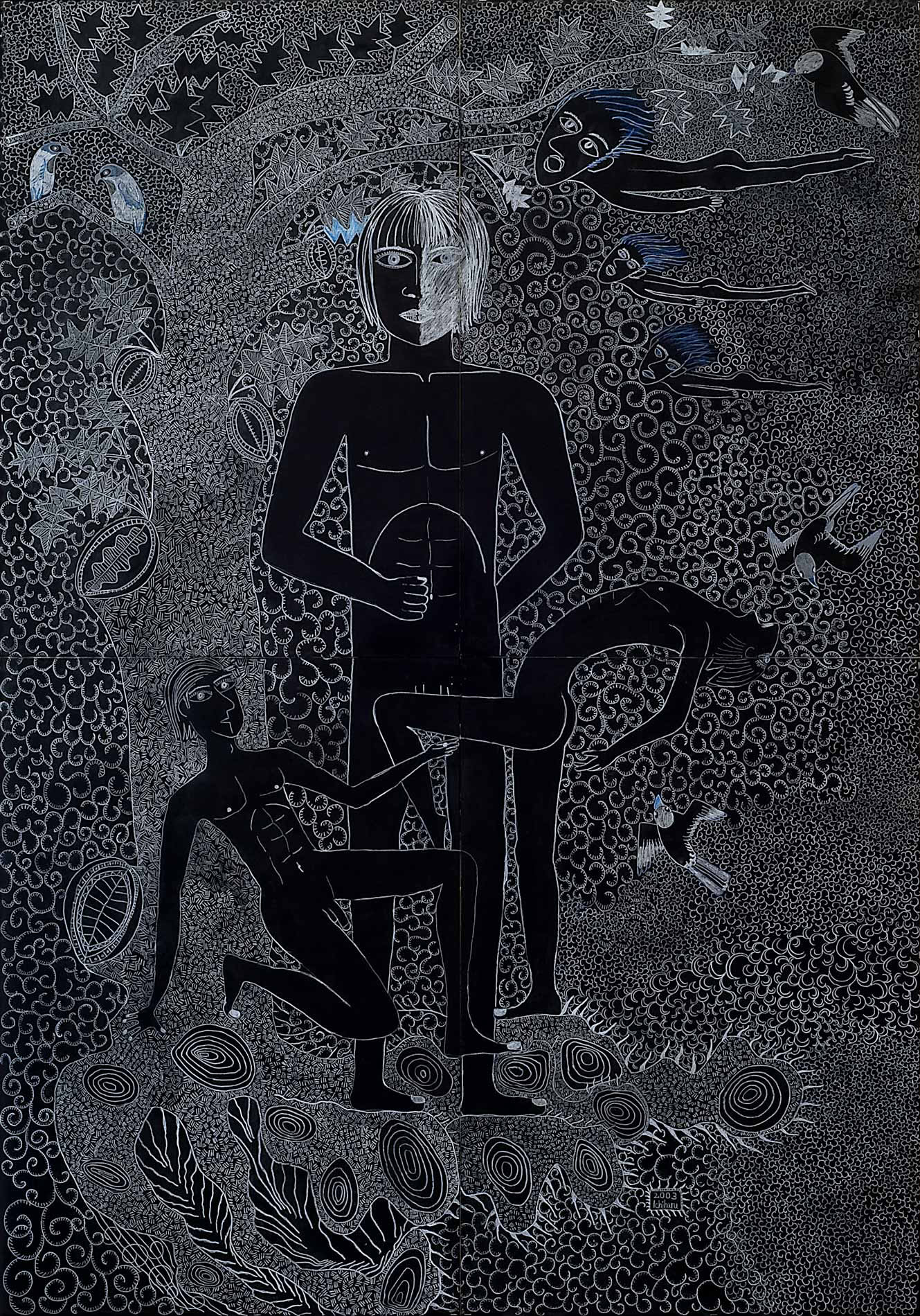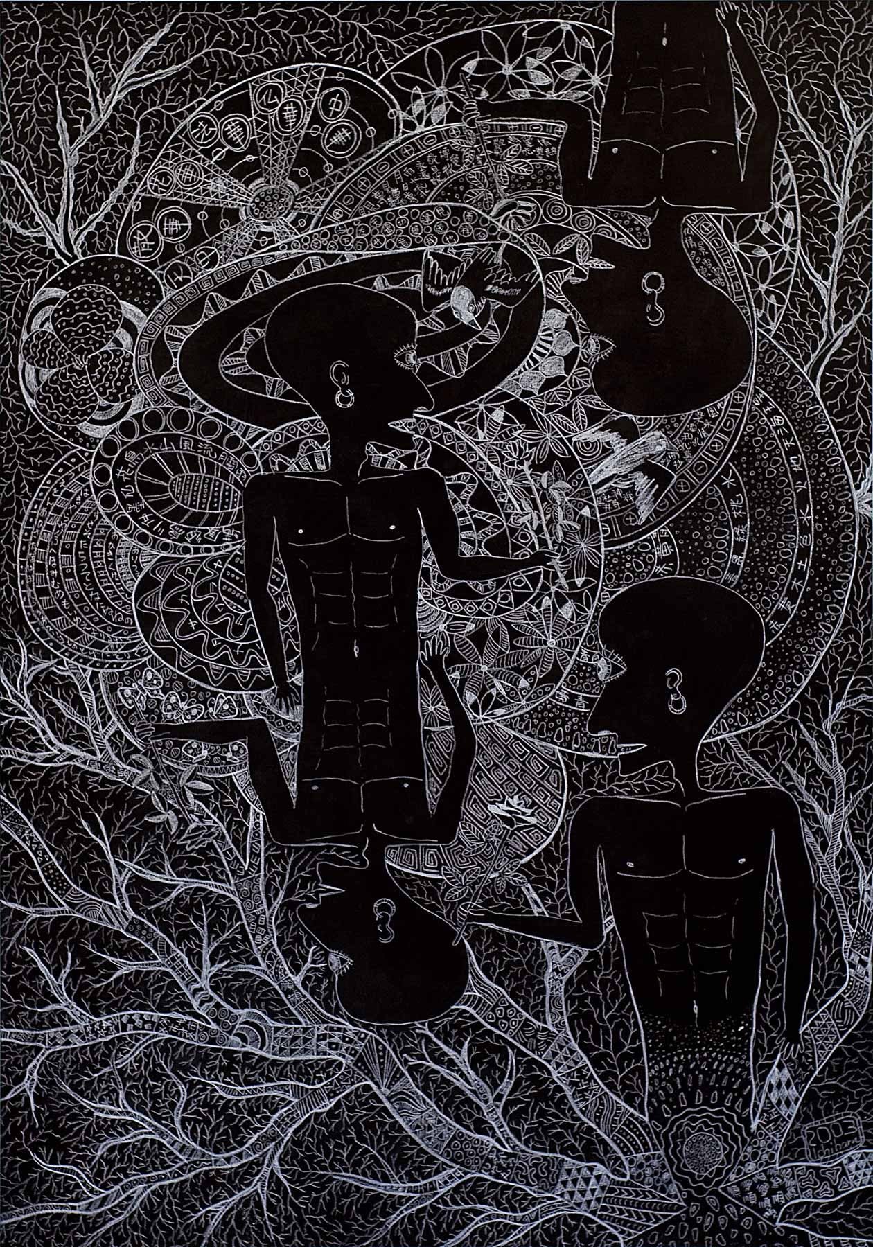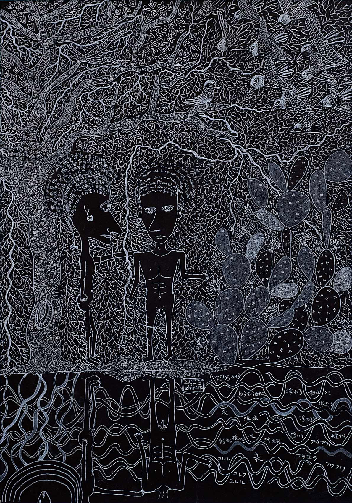 »...Ichiharu Yamada: vollendet gefüllte Formate. Und auch hier wieder Menschenkörper, Männerkörper. Das Geschlecht als schüchterne doch, präzise Klassifizierung. Die Männer inmitten einer Vegetation, die Henri Rousseaus Idyllen sehr ähnlich sind. Nur eben dass Rousseau die Farben liebte und Ichiharu Yamada die weiße Linie auf schwarzem Grund. Der Leib - humane Zierde - schält sich aus dem Ornament aus Wurzeln, Blüten und Blättern - Gravuren mit weißem Buntstift auf Graukarton. Sie sind wie Wucherungen auf dem Papier, ornamentales Wachstum, das für den Drang stehen mag, alles, wessen die zeichnende Hand habhaft wird, zu markieren, zu bezeichnen und mit einem rhythmischen Grundrauschen zu unterlegen...« Grit Weber