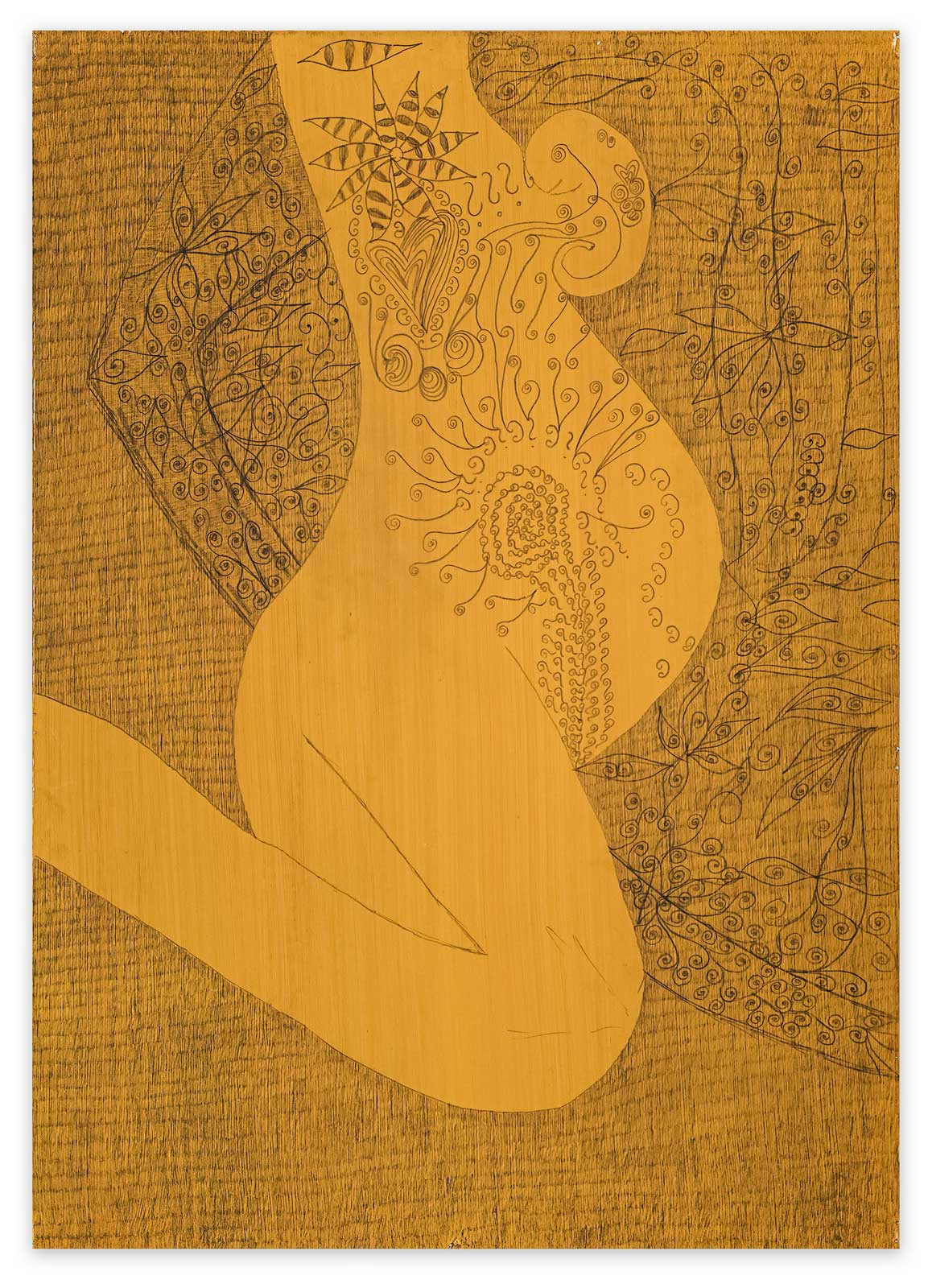 Zunächst fällt die ungewöhnliche Größe der feingliedrigen Zeichnung auf. Überlebensgroß schälen sich die Figuren aus einem Strich für Strich gearbeiteten Hintergrund. Zentral in der Mitte des Bildes die bereits entschleierte Salome mit weit geöffnetem Geschlecht und einem Fisch im Bauch, aus übergroßen Augen schaut sie den Betrach- ter ungerührt an, rechts die Verführerin Herodias als schwangere Frau