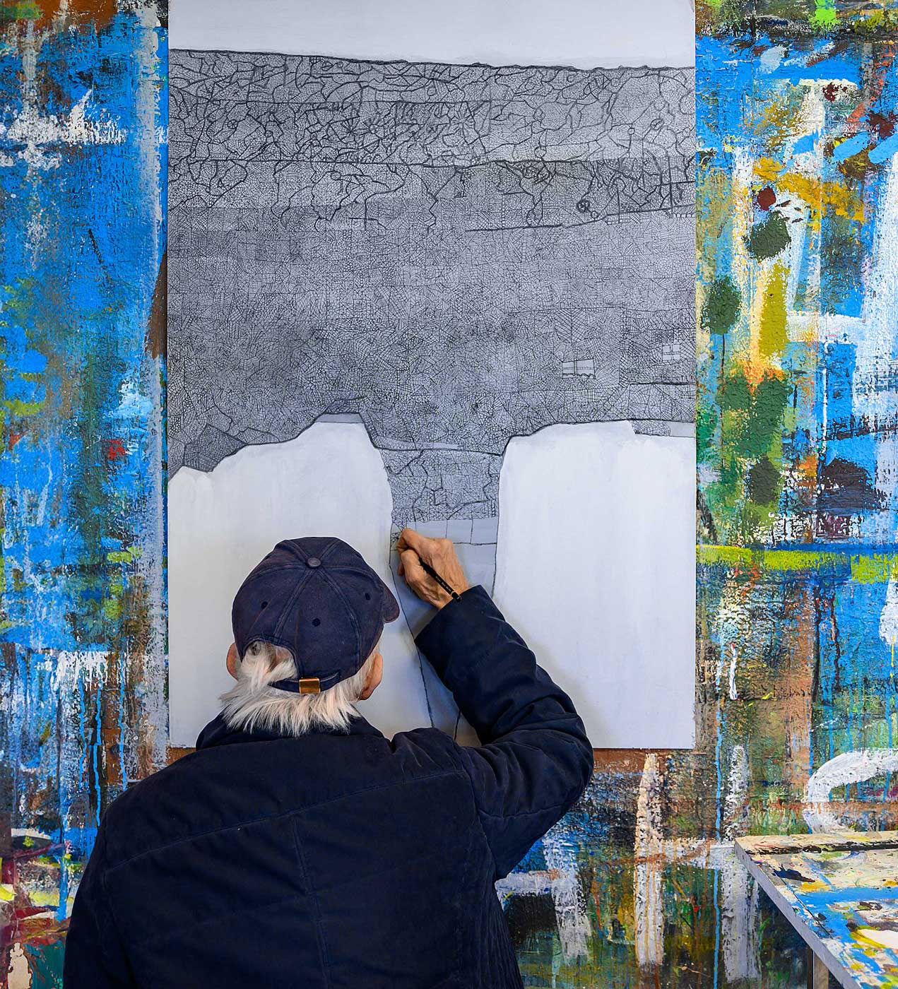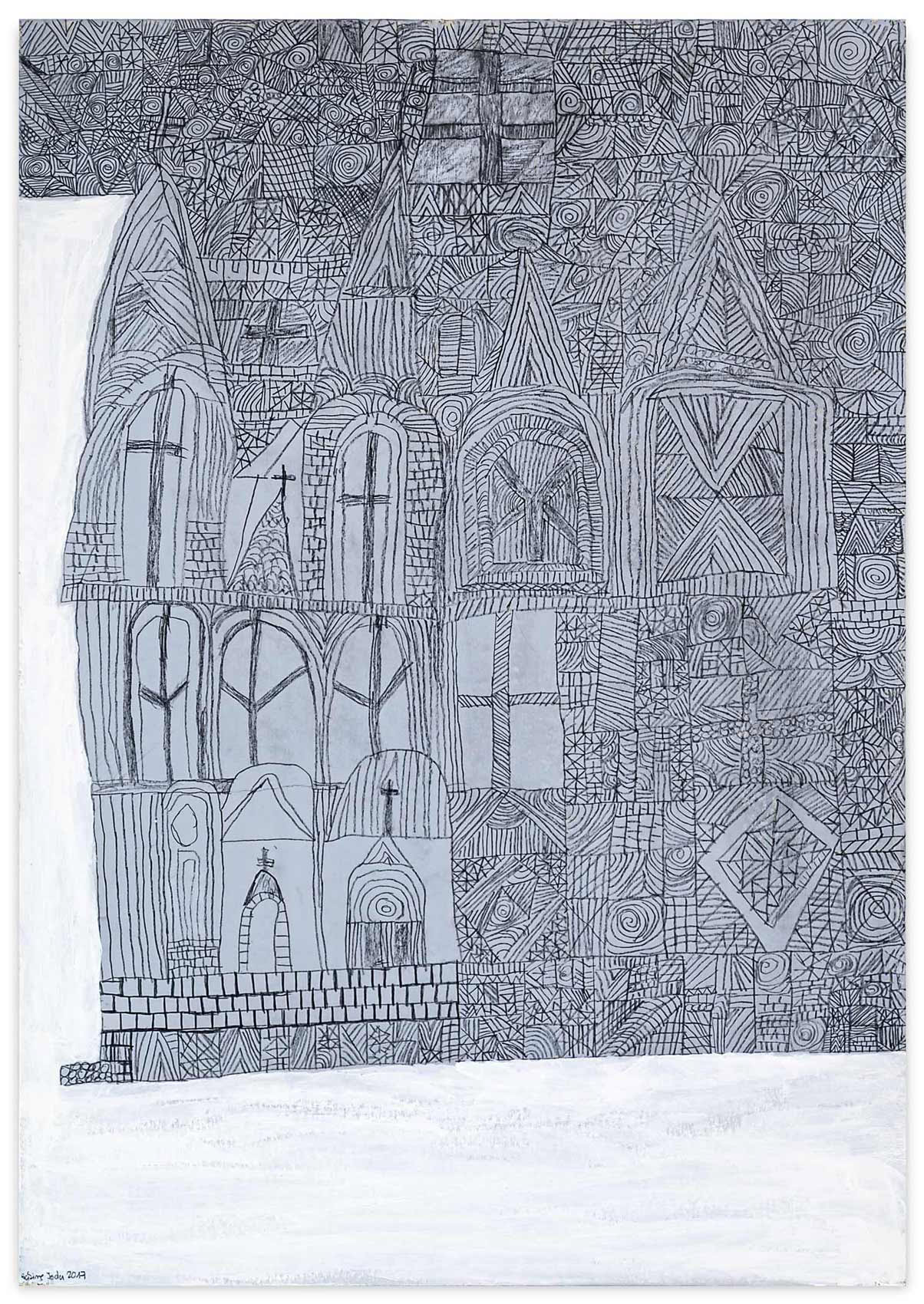 Baut man eine Haus, muss man mit dem Fundament anfangen. Man ist angewiesen auf Statik und methodische Vorgehensweise. Ansonsten kehrt der Stein nach Aristoteles zu seiner natürlichen Eigenschaft zurück: der Haufenhaftigkeit. Zeichnet man eine Haus, kann man allerdings mit den Wolken darüber anfangen. Sabine Isolas Architekturen sind keine Bauzeichnungen. Sie entstehen vielmehr in einem organischen Wachstumsprozess. An einer Stelle begonnen, beginnen sie ihr Eigenleben, wachsen fort. Sabine Isola fehlt die Übersicht beim Zurücktreten. 15 Prozent Sehkraft besitzt sie noch. Nur aus nächster Nähe sieht sie noch einigermaßen klar und scharf. Gleichwohl, sie hält einen bildnerischen Konstruktionsplan ein. Auch wenn ihre Architekturlandschaften bisweilen nicht in den sondern aus dem Himmel wachsen.