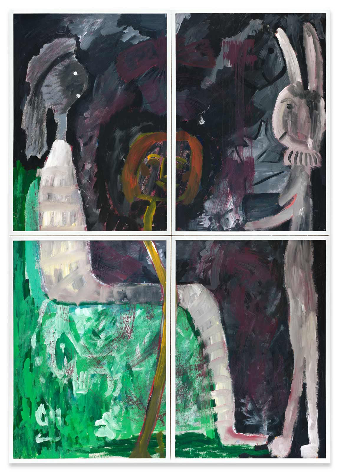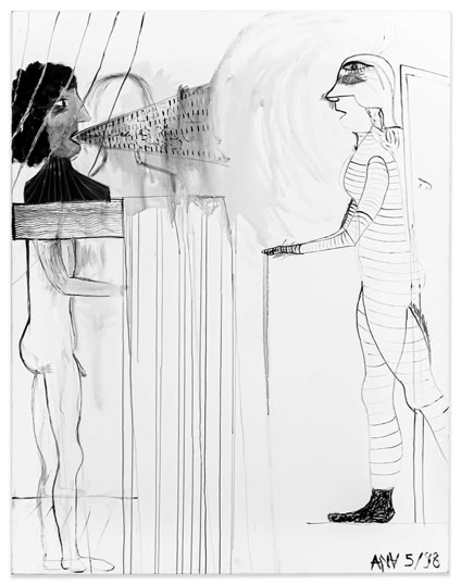 Das Visier findet sich in vielen Bildern von ANA, nicht nur in der „Dolchstoßlegende“. Ihre Bilder thematisieren Zwischenmenschliches. Und allzu oft ist die Kommunikation gestört. Das Visier als Schutz und als Hindernis, die zum Stoß erhobene Hand gegen die beschwichtigende auf den Schenkel gelegte. Die behelmte Figur taucht in vielen Bildern auf. Sie scheint ANAs bildnerisches Alter Ego zu sein. „Mit gefälltem Visier“ zieht sie weniger „den Trümmern des Himmels“ (Paul Celan) als den Zumutungen des Lebens entgegen. Die meisten Figuren ANAs agieren flächenparallel. Sie nehmen weder Kontakt mit dem Betrachter noch innerbildlich untereinander auf. ANA verarbeitet in ihren Bildern eigene Erlebnisse und Erfahrungen, Verwundungen und Kränkungen. Sie hatte studiert, spielte Geige und Klavier, nahm Gesangsunterricht. Vor der Krankheit. Sie malt mit vollem Risiko, emotional, sie malt viel und schnell. Auch Krankheit kränkt. Ihre Bilder tun es nicht: Deren „traumwandlerische Sicherheit“ (Klaus Vogelgesang) ist erarbeitet, von zehn Bildern bleibt eines und das ist gut.