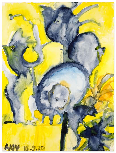 ANA ist eine der ersten künstlerischen Entdeckungen im Atelier von Vitos Rheingau. Viele Ihrer großformatigen, beeindruckenden Arbeiten entstanden während akuter Krankheitsphasen und Klinikaufenthalten zwischen 1998 und 2001. Danach zog sie aus beruflichen wie privaten Gründen fort. Der Kontakt zum Atelier ist über all die Jahre erhalten geblieben. Für die Ausstellung Gratlinig hat ANA neben den Arbeiten, die Sie der Sammlung des Ateliers überlassen hat, einige Aquarelle aus jüngerer Produktion beigesteuert.