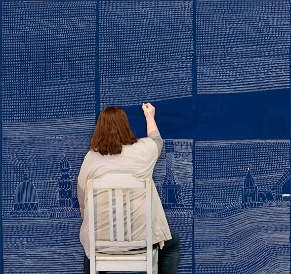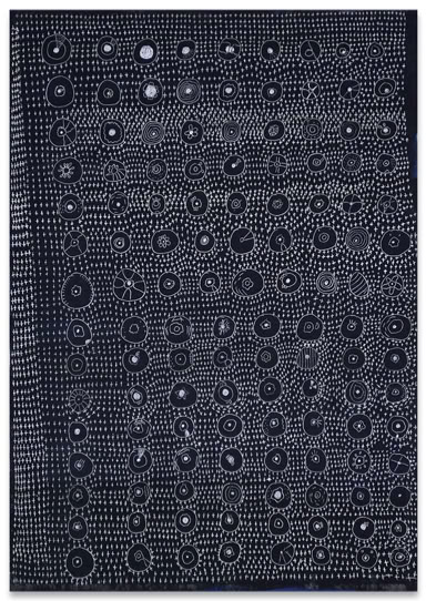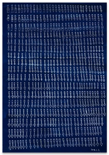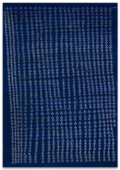 „Es geht eine Träne auf Reisen“ und „Tränen lügen nicht“. Zwei Schlager aus den 1970iger Jahren, die Cornelia Trabhardt wohl vertraut sind. Und in ihrem Falle gingen bereits mehrere 100 000 Tränen im wahrsten Sinne des Wortes auf Reisen. Zu den unterschiedlichsten Ausstellungsorten. 3000 bis 7000 dieser Gebilde finden sich auf einer Arbeit der Größe 100 x 70 Zentimeter. Doch obwohl die wiederkehrende ornamentale Fülle ihrer Tränen wie eine Beschriftung wirkt, sind ihre Bilder nicht tränenselig. Es sind keine Erkundungen im Tränenreich. Sie sind Ausdruck eines tätigen Denkens von Gegenwart. Eine Träne ist eine Träne ist eine Träne. Sie verbergen auch nicht, aus was und wie sie gemacht sind. Ihre Tränen lügen nicht. Wenn sie doch etwas erzählen, dann sprechen sie von Geduld, Beharrungsvermögen und von der schlichten Schönheit der handgemachten und dadurch immer leicht variierenden Wiederholung eines Motivs. Cornelia Trabhardt's Bilder wollen insofern weniger gelesen als schlichtweg betrachtet werden.