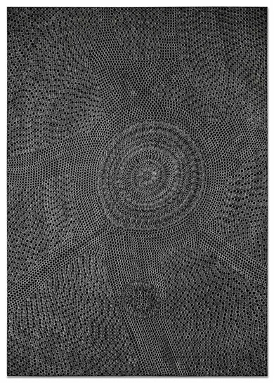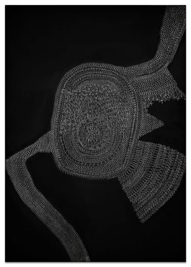Es beginnt mit einer kleinen abstrakten geometrischen Form auf einer großen ausgespannten Fläche. Ein Kreis, ein Quadrat, eine Raute. Bleistift auf schwarzem Grund. Eine weitere Form kommt hinzu. Oft von mehreren Stellen aus fügen sich Inseln zusammen. Nur die Anschauung gibt zunächst an, was der nächste Arbeitsschritt ist. Aus diesem tätigen Denken von Gegenwart entsteht ein Gebilde und irgendwann im Arbeitsprozess ein Gedanke, eine vage Vision. Ihr spürt Heike Ilkhani weiter nach. Man könnte fast sagen das Ornament verfolgt nun ein Narrativ: "Manchmal hab ich mir gedacht es soll ein Elefant werden und dann ist es doch keiner geworden." Im doppelten Sinne von innen heraus erkundet Heike Ilkhani Formengebilde, die interpretierbar sind. Die Bildtitel geben Hinweise auf ihre eigenen Assoziationen: "Le Qoc", "la Poule" und "die Kinder". Das Silbrige Mineralische des Bleistiftes hebt sich glänzend von der schwarzmonochromen Fläche ab. Ihre Bilder verändern sich abhängig von Lichteinfall und Betrachtungsposition deutlich.