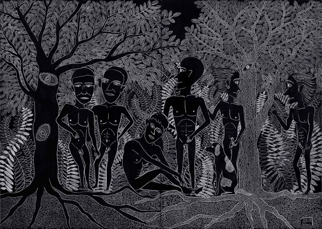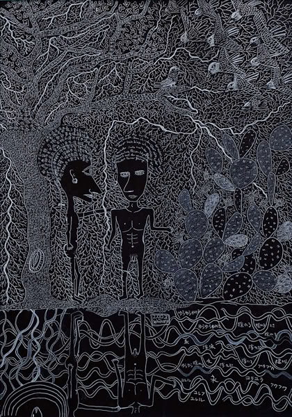 »...Ichiharu Yamada: vollendet gefüllte Formate. Und auch hier wieder Menschenkörper, Männerkörper. Das Geschlecht als schüchterne doch, präzise Klassifizierung. Die Männer inmitten einer Vegetation, die Henri Rousseaus Idyllen sehr ähnlich sind. Nur eben dass Rousseau die Farben liebte und Ichiharu Yamada die weiße Linie auf schwarzem Grund. Der Leib - humane Zierde - schält sich aus dem Ornament aus Wurzeln, Blüten und Blättern - Gravuren mit weißem Buntstift auf Graukarton. Sie sind wie Wucherungen auf dem Papier, ornamentales Wachstum, das für den Drang stehen mag, alles, wessen die zeichnende Hand habhaft wird, zu markieren, zu bezeichnen und mit einem rhythmischen Grundrauschen zu unterlegen...« Grit Weber
