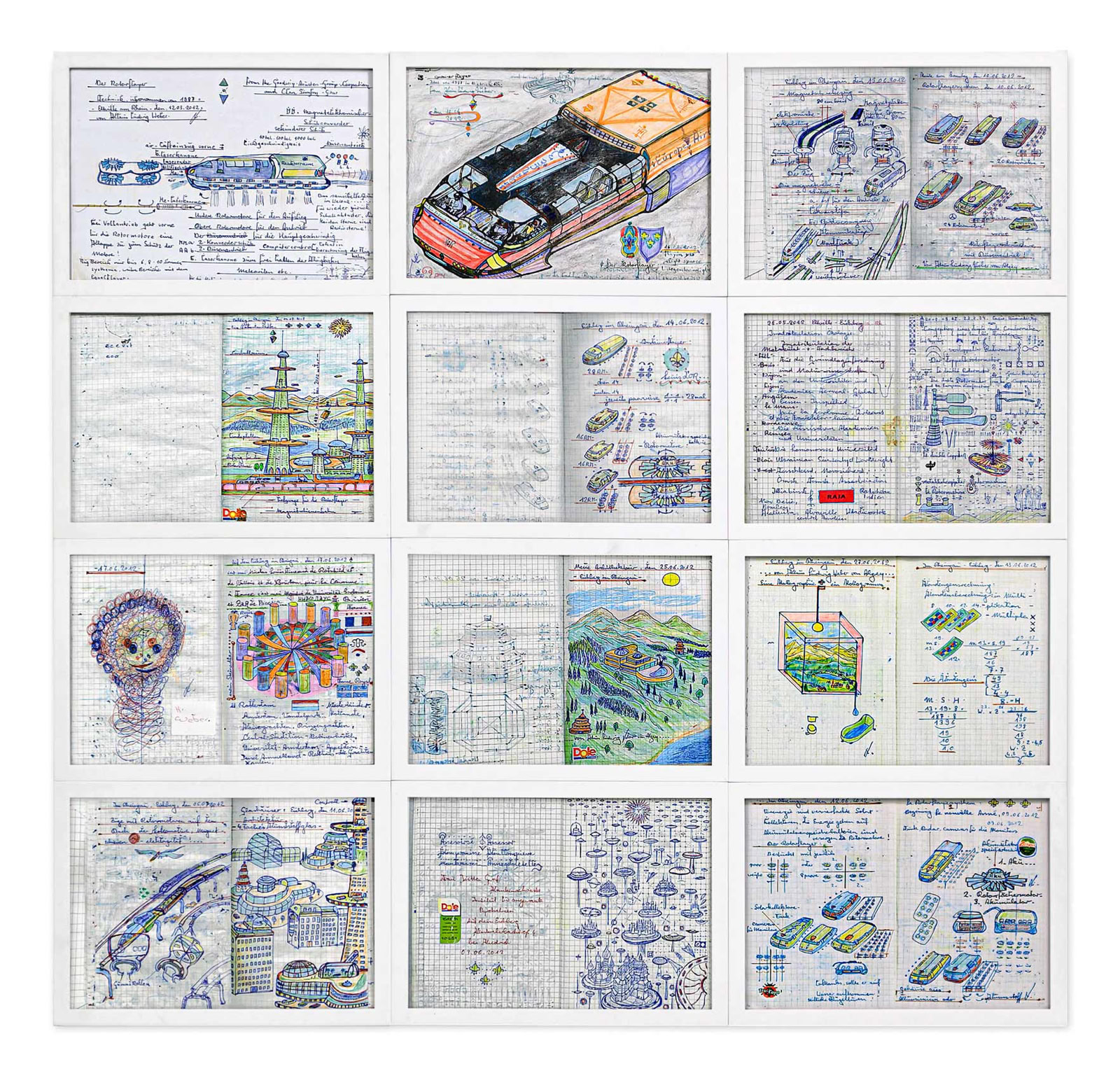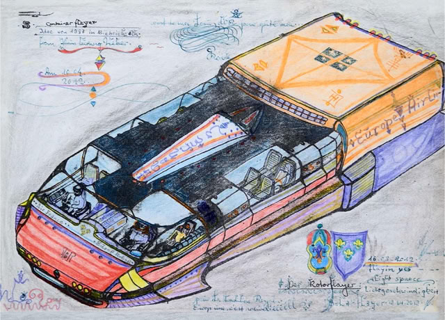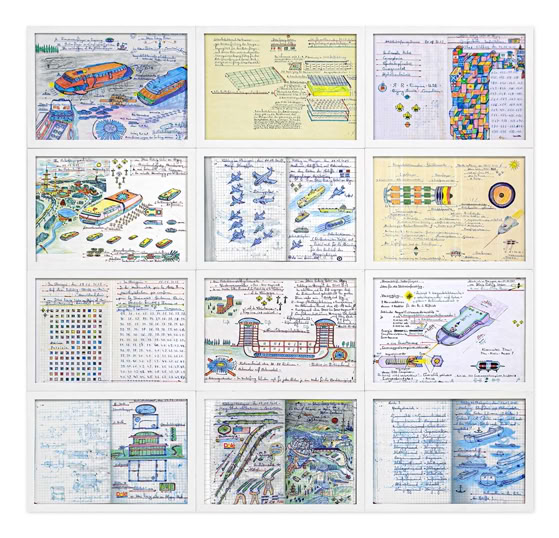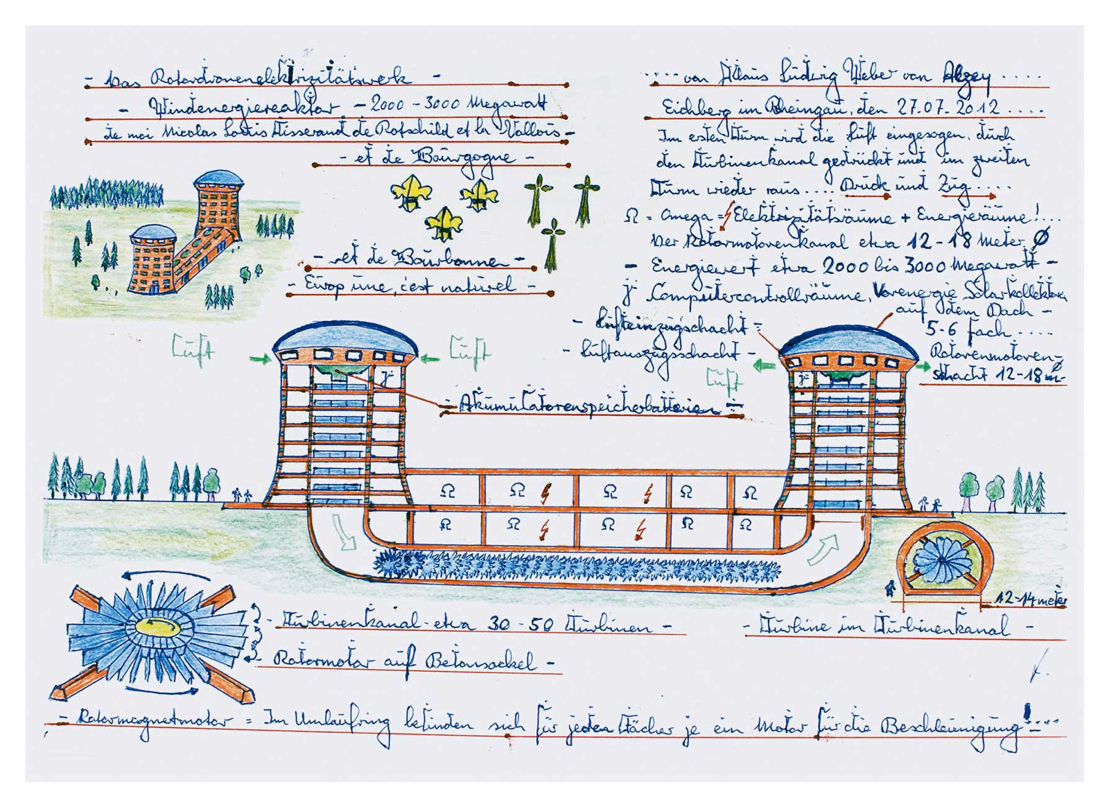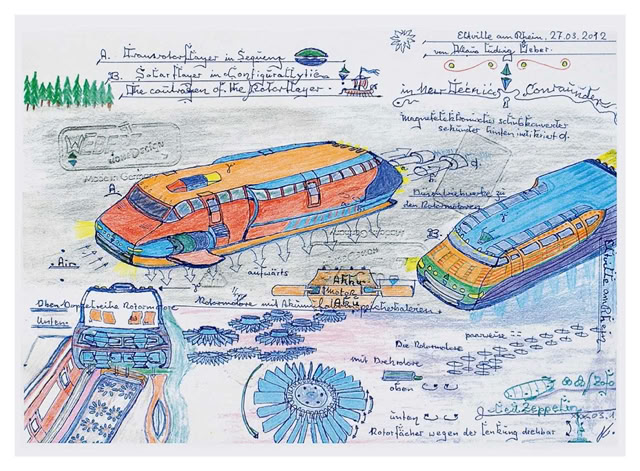 Gleichwohl zeigen die Ausschmückungen und farbigen Fassungen auch eine Lust am Gestalten. „Alles begann mit dem Rotorflyer, darauf folgte das Rotordronenelektrizitätswerk.“ Bei ihm sind mehrere Windräder in einem Windkanal mit Sogwirkung verlustfrei hintereinander gestaffelt. Eine Alternative zur überirdischen Aufstellung von Windrädern.