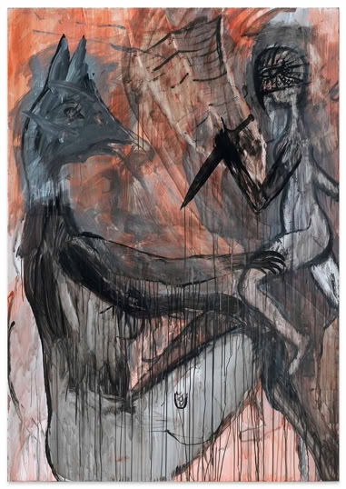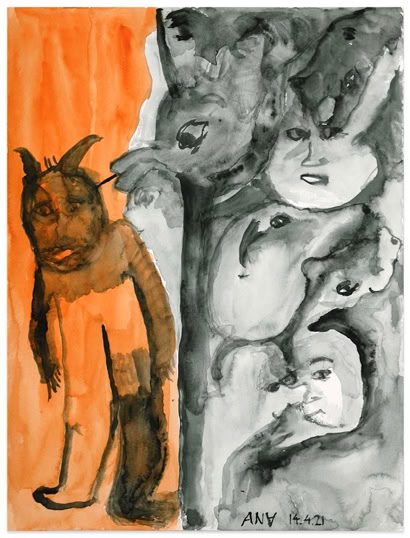 Das Visier findet sich in vielen Bildern von ANA, nicht nur in der „Dolchstoßlegende“. Ihre Bilder thematisieren Zwischenmenschliches. Und allzu oft ist die Kommunikation gestört. Das Visier als Schutz und als Hindernis, die zum Stoß erhobene Hand gegen die beschwichtigende auf den Schenkel gelegte. Die behelmte Figur taucht in vielen Bildern auf. Sie scheint ANAs bildnerisches Alter Ego zu sein. „Mit gefälltem Visier“ zieht sie weniger „den Trümmern des Himmels“ (Paul Celan) als den Zumutungen des Lebens entgegen. Die meisten Figuren ANAs agieren flächenparallel. Sie nehmen weder Kontakt mit dem Betrachter noch innerbildlich untereinander auf. ANA verarbeitet in ihren Bildern eigene Erlebnisse und Erfahrungen, Verwundungen und Kränkungen. Sie hatte studiert, spielte Geige und Klavier, nahm Gesangsunterricht. Vor der Krankheit. Sie malt mit vollem Risiko, emotional, sie malt viel und schnell. Auch Krankheit kränkt. Ihre Bilder tun es nicht: Deren „traumwandlerische Sicherheit“ (Klaus Vogelgesang) ist erarbeitet, von zehn Bildern bleibt eines und das ist gut.