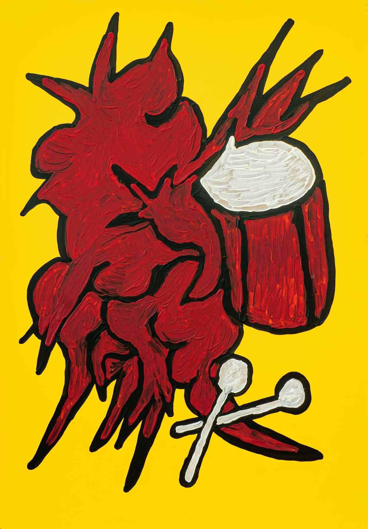 Angesichts jener alten Verzweiflung erscheinen die Bilder von Angie Beyer heiter, quirlig, voller Lebenselan. Menschenähnlich, in Aktion und Interaktion, wie in einem Comicstrip sind ihre Gestalten. Und bunt. Schwarz, Gold, Rot hilft dem Maler aus der Not. Die etwas despektierliche Äußerung könnte im Falle von Angie Beyer eine ganz neue Bedeutung bekommen. Schnell sind sie gemalt, roh, voller Ungeduld: auf Tischen, Stühlen, Schränken, Musikinstrumenten und natürlich Vogelhäuschen. Man findet sie auf Buchdeckeln und als Drucke. Sie laden dazu ein, Geschichten zu erspüren, zu erfinden und weiterzuerzählen.