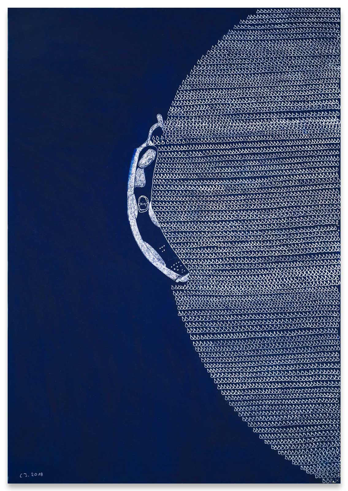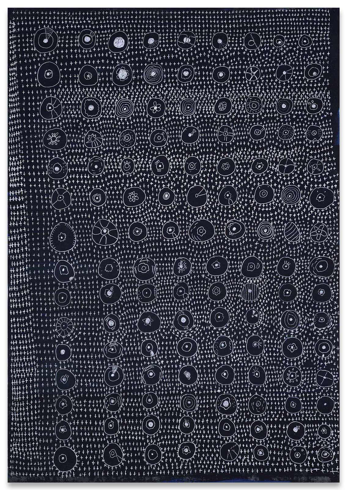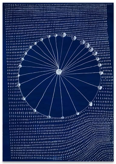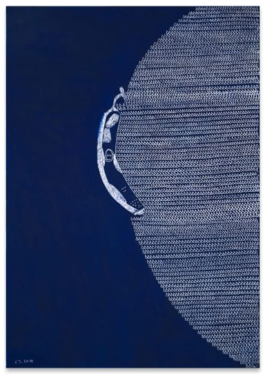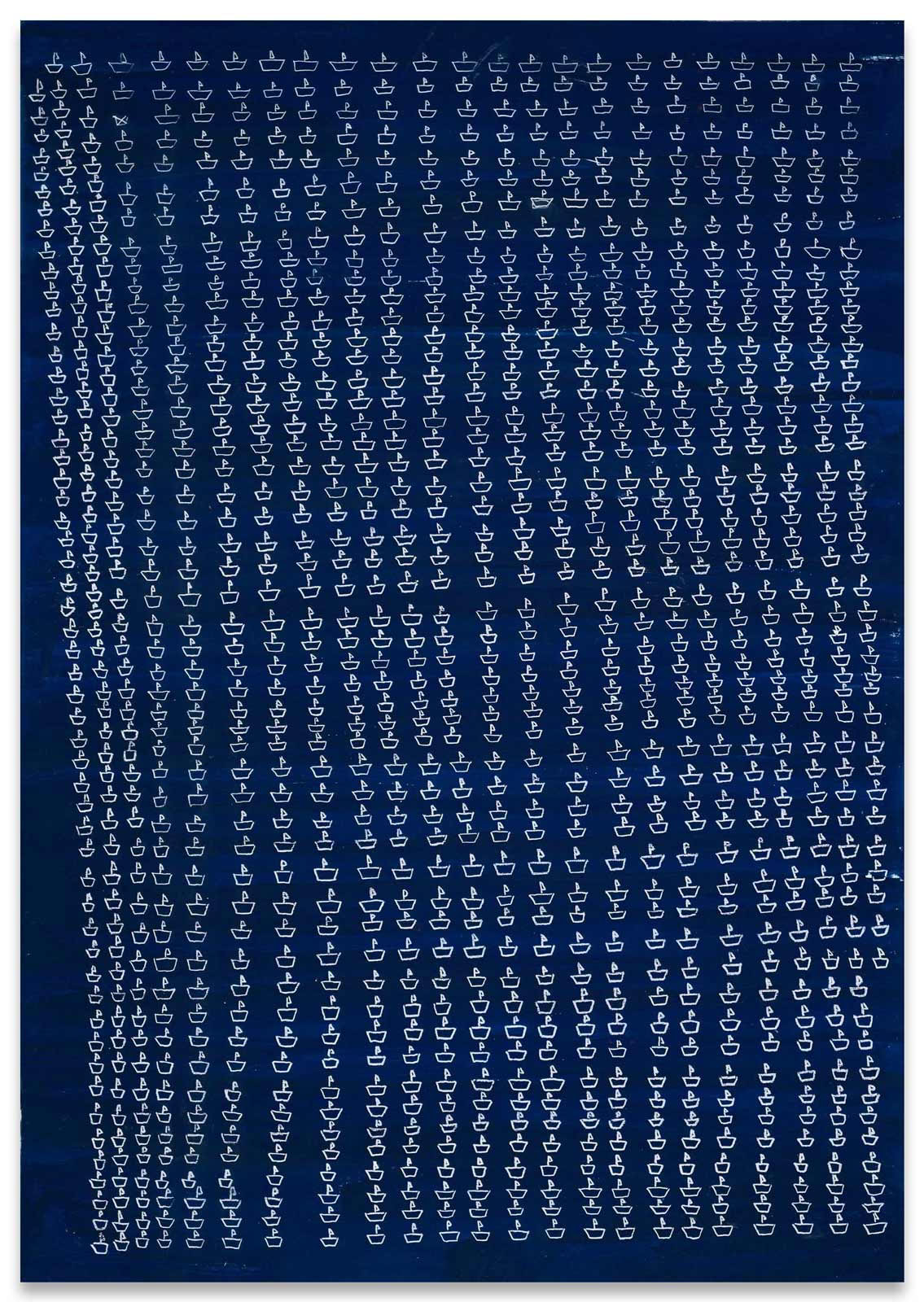 „Es geht eine Träne auf Reisen“ und „Tränen lügen nicht“. Zwei Schlager aus den 1970iger Jahren, die Cornelia Trabhardt wohl vertraut sind. Und in ihrem Falle gingen bereits mehrere 100 000 Tränen im wahrsten Sinne des Wortes auf Reisen. Zu den unterschiedlichsten Ausstellungsorten. 3000 bis 7000 dieser Gebilde finden sich auf einer Arbeit der Größe 100 x 70 Zentimeter. Doch obwohl die wiederkehrende ornamentale Fülle ihrer Tränen wie eine Beschriftung wirkt, sind ihre Bilder nicht tränenselig. Es sind keine Erkundungen im Tränenreich. Sie sind Ausdruck eines tätigen Denkens von Gegenwart. Eine Träne ist eine Träne ist eine Träne. Sie verbergen auch nicht, aus was und wie sie gemacht sind. Ihre Tränen lügen nicht. Wenn sie doch etwas erzählen, dann sprechen sie von Geduld, Beharrungsvermögen und von der schlichten Schönheit der handgemachten und dadurch immer leicht variierenden Wiederholung eines Motivs. Cornelia Trabhardt's Bilder wollen insofern weniger gelesen als schlichtweg betrachtet werden.