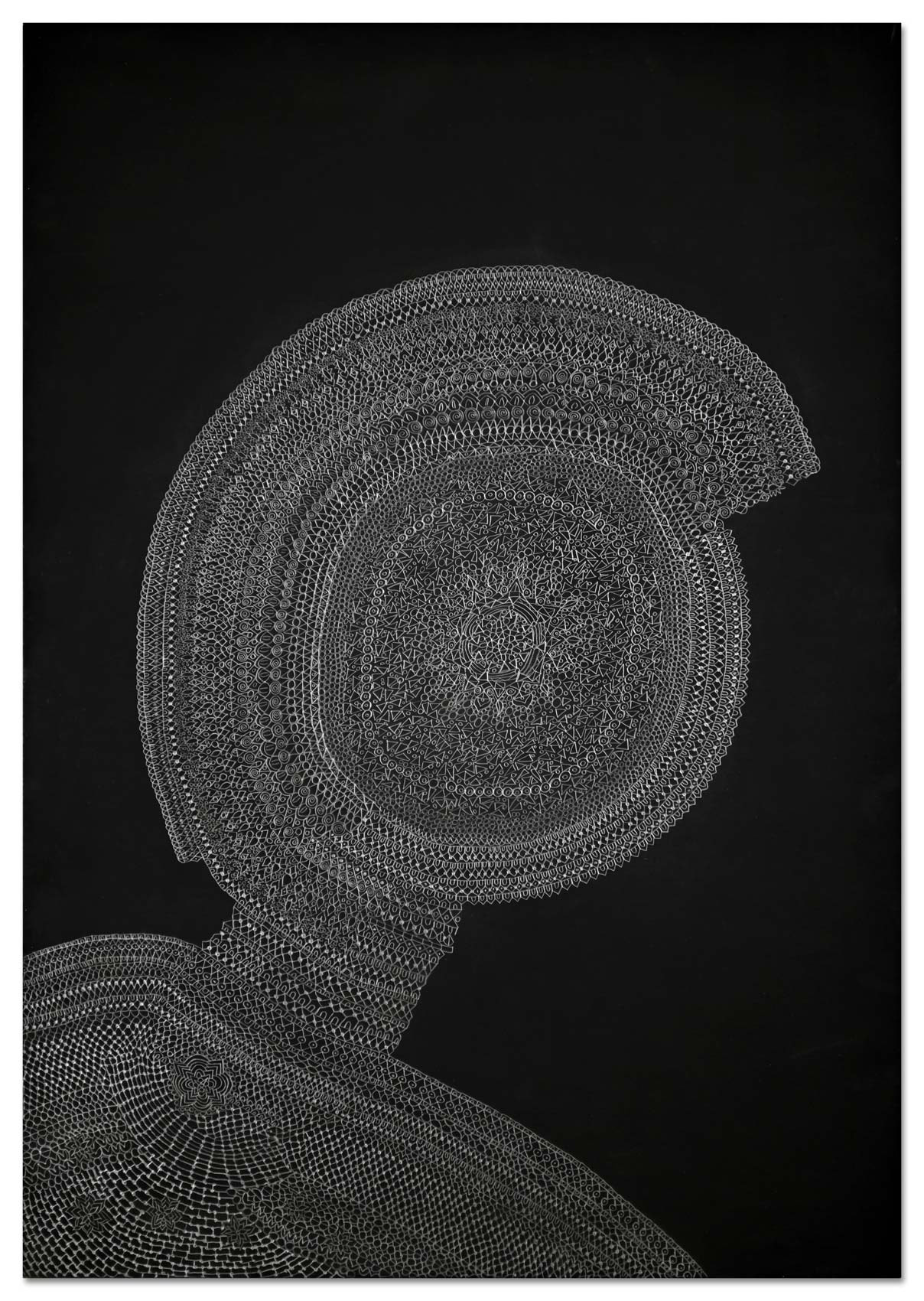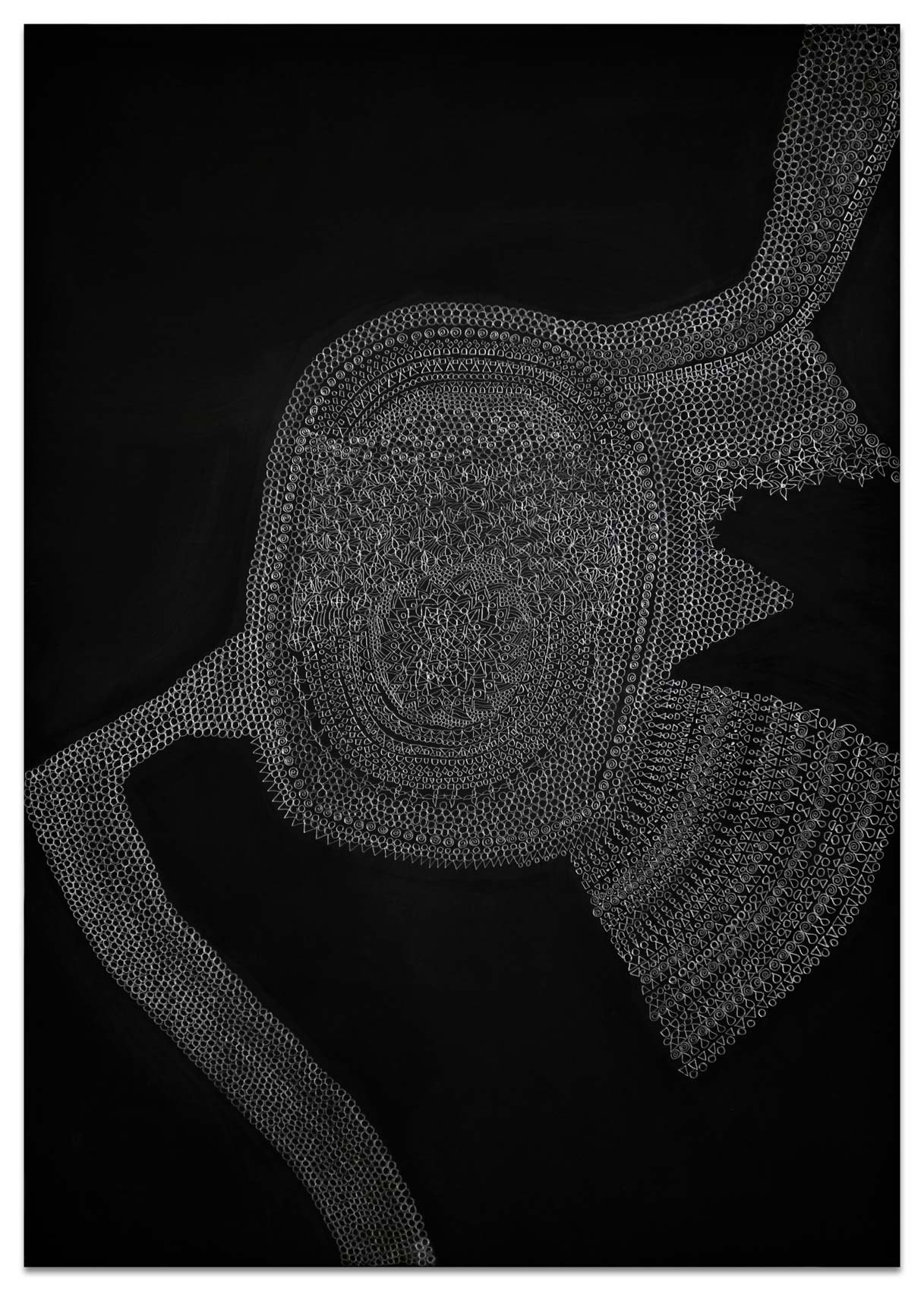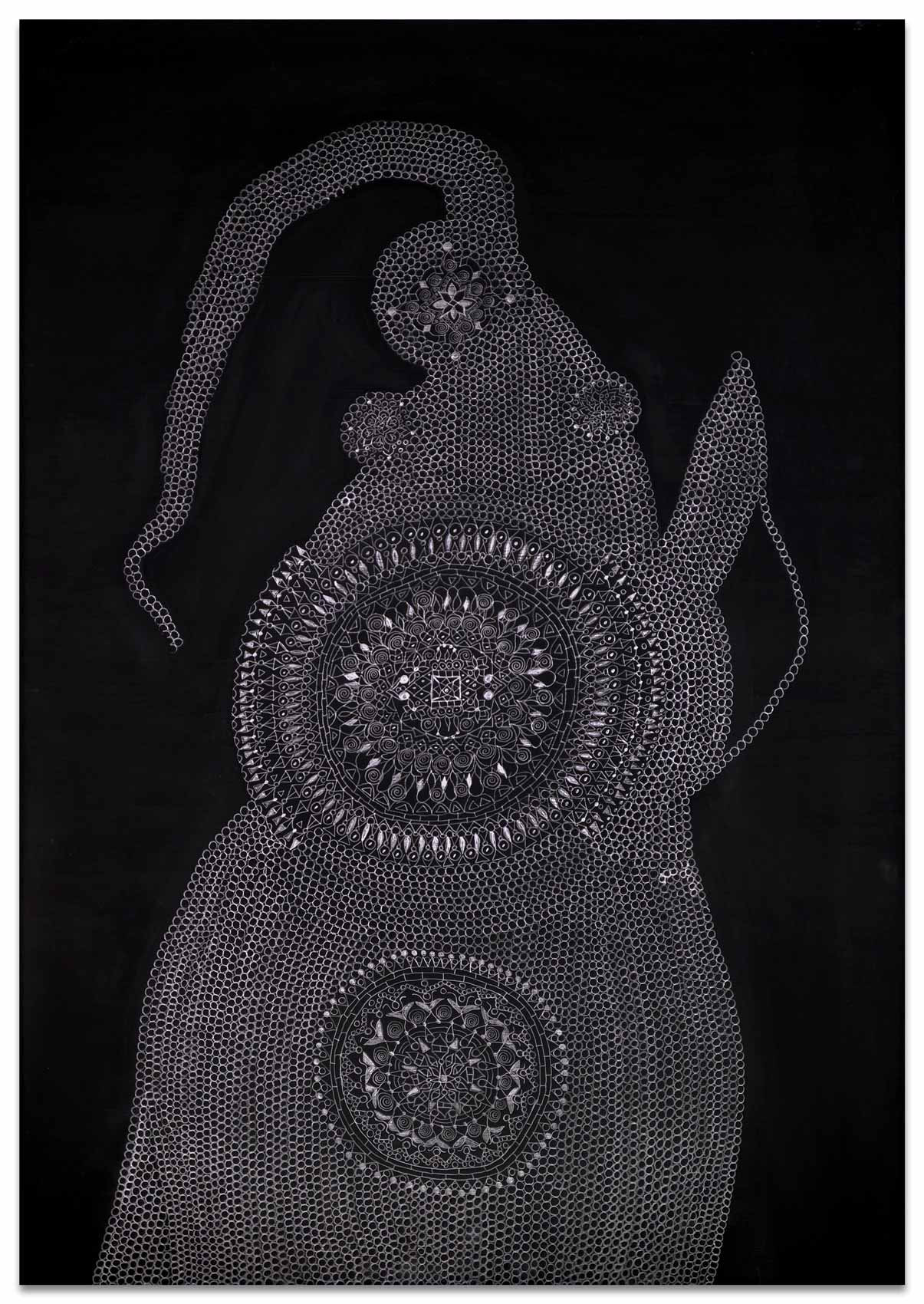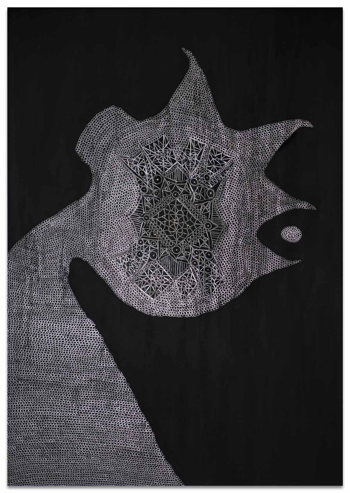Es beginnt mit einer kleinen abstrakten geometrischen Form auf einer großen ausgespannten Fläche. Ein Kreis, ein Quadrat, eine Raute. Bleistift auf schwarzem Grund. Eine weitere Form kommt hinzu. Oft von mehreren Stellen aus fügen sich Inseln zusammen. Nur die Anschauung gibt zunächst an, was der nächste Arbeitsschritt ist. Aus diesem tätigen Denken von Gegenwart entsteht ein Gebilde und irgendwann im Arbeitsprozess ein Gedanke, eine vage Vision. Ihr spürt Heike Ilkhani weiter nach. Man könnte fast sagen das Ornament verfolgt nun ein Narrativ: "Manchmal hab ich mir gedacht es soll ein Elefant werden und dann ist es doch keiner geworden." Im doppelten Sinne von innen heraus erkundet Heike Ilkhani Formengebilde, die interpretierbar sind. Die Bildtitel geben Hinweise auf ihre eigenen Assoziationen: "Le Qoc", "la Poule" und "die Kinder". Das Silbrige Mineralische des Bleistiftes hebt sich glänzend von der schwarzmonochromen Fläche ab. Ihre Bilder verändern sich abhängig von Lichteinfall und Betrachtungsposition deutlich.