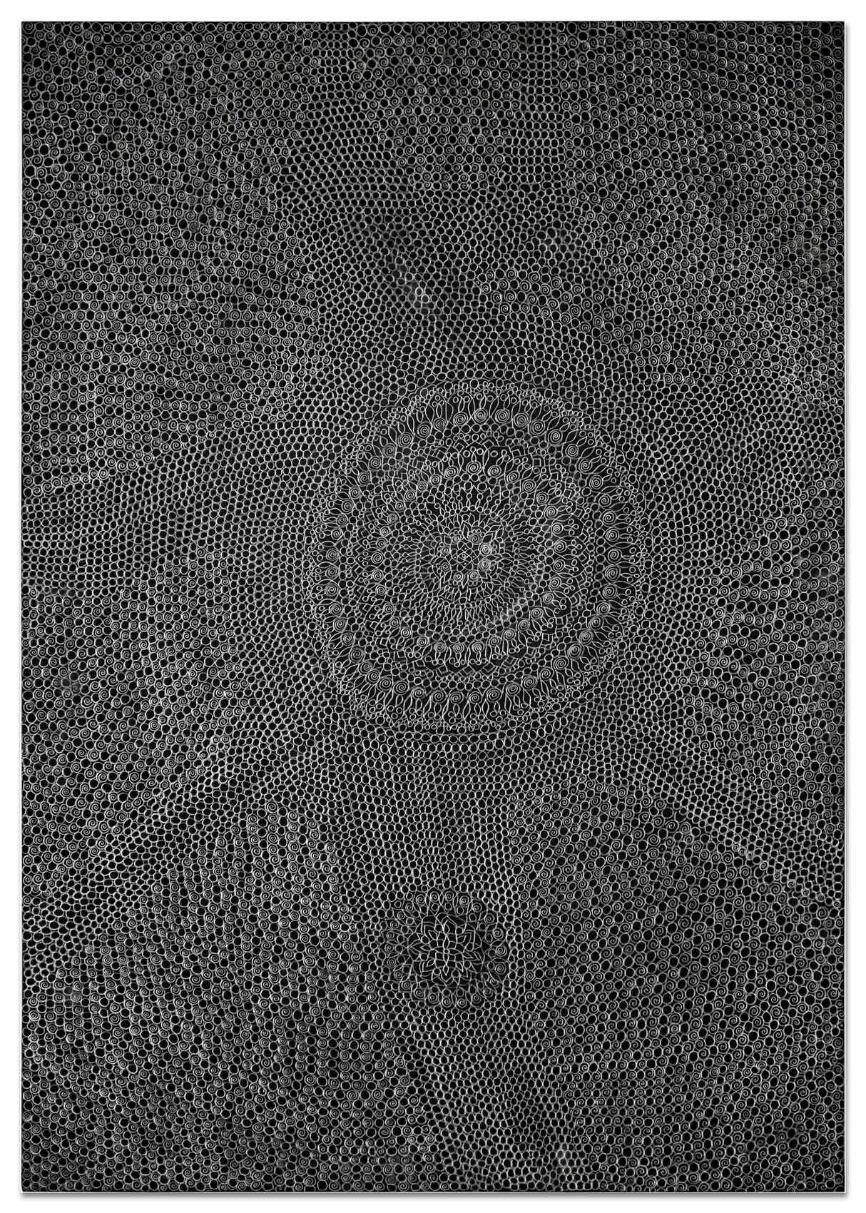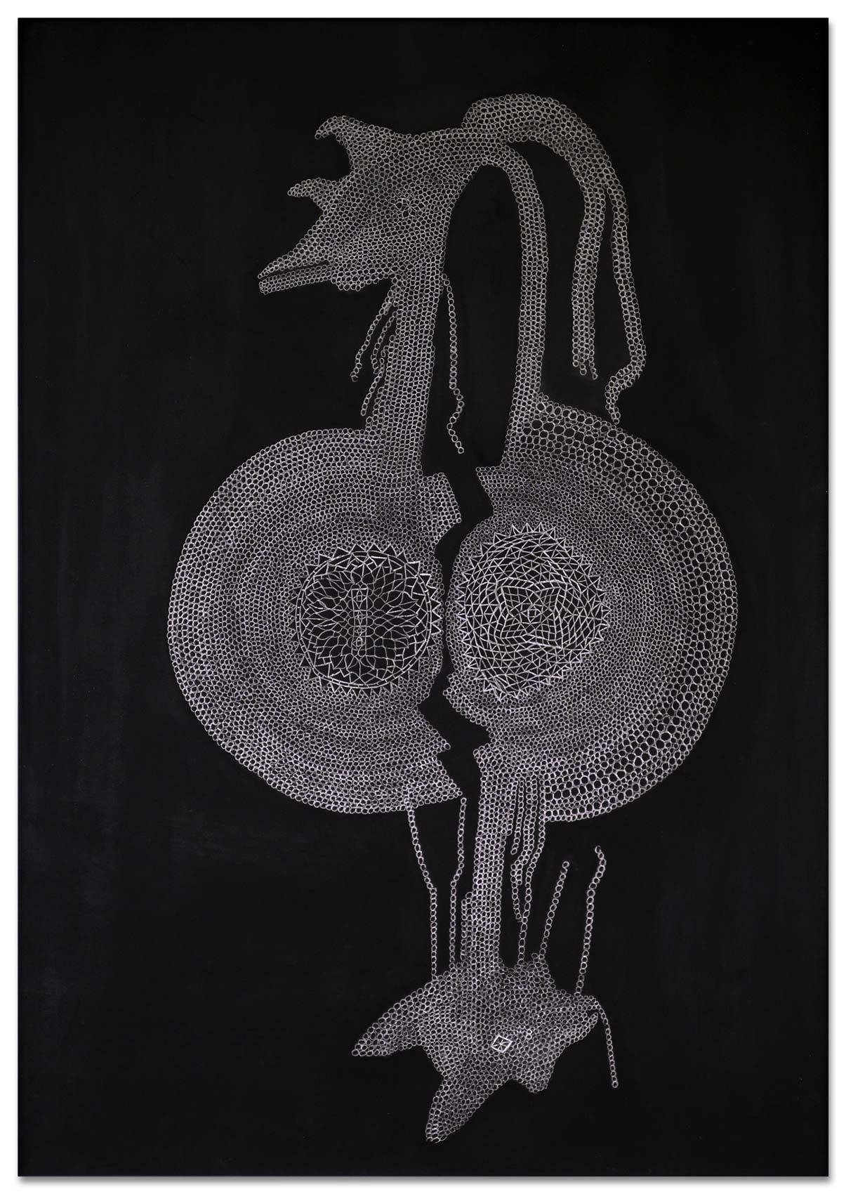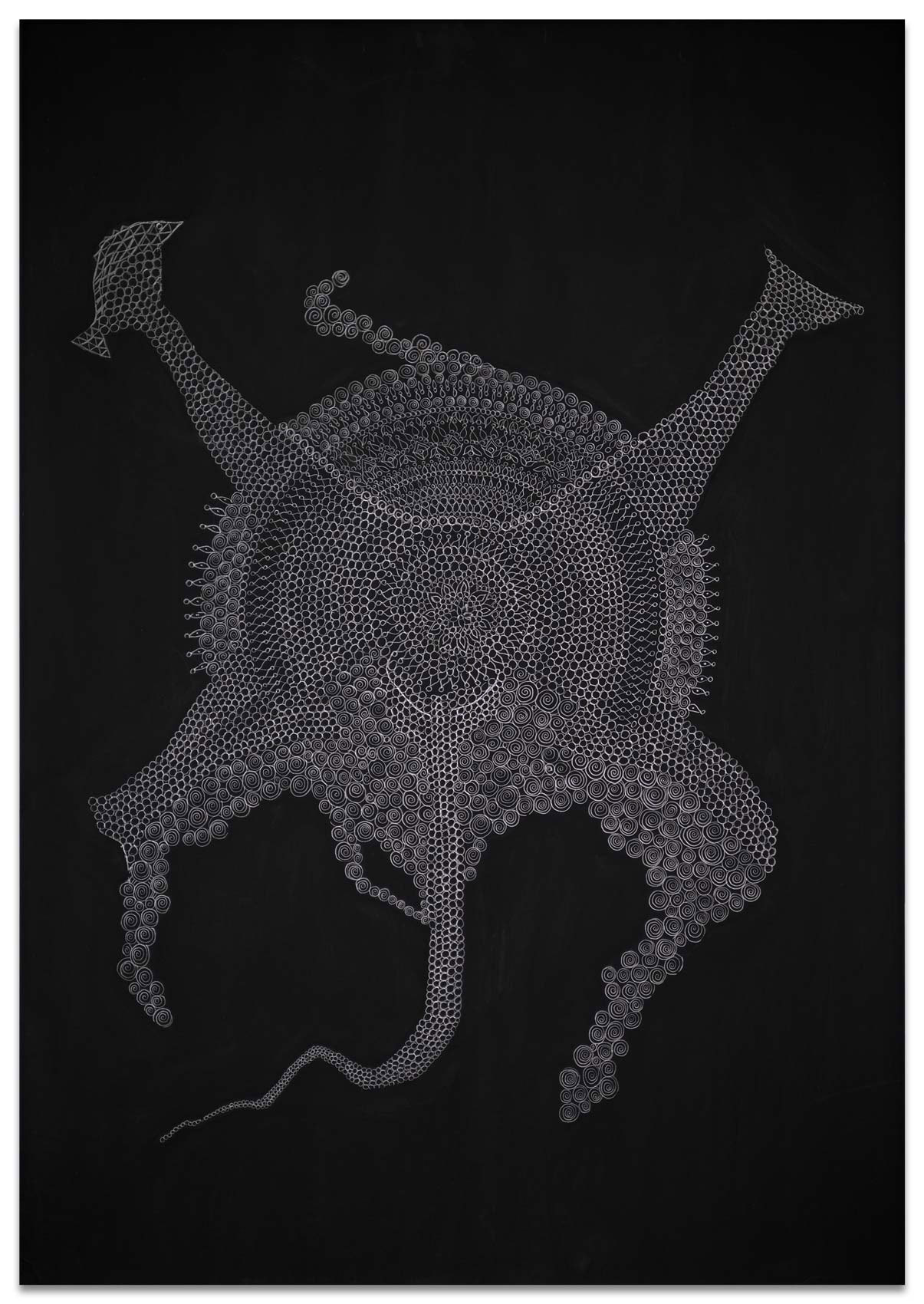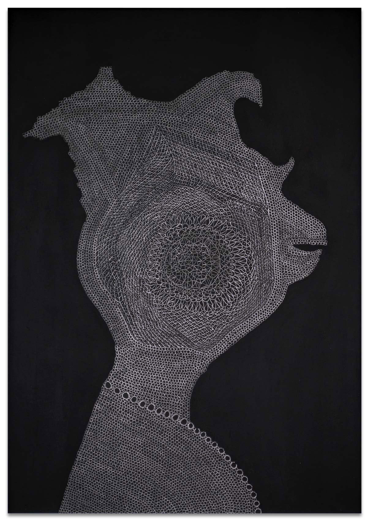 Es beginnt mit einer kleinen abstrakten geometrischen Form auf einer großen ausgespannten Fläche. Ein Kreis, ein Quadrat, eine Raute. Bleistift auf schwarzem Grund. Eine weitere Form kommt hinzu. Oft von mehreren Stellen aus fügen sich Inseln zusammen. Nur die Anschauung gibt zunächst an, was der nächste Arbeitsschritt ist. Aus diesem tätigen Denken von Gegenwart entsteht ein Gebilde und irgendwann im Arbeitsprozess ein Gedanke, eine vage Vision. Ihr spürt Heike Ilkhani weiter nach. Man könnte fast sagen das Ornament verfolgt nun ein Narrativ: "Manchmal hab ich mir gedacht es soll ein Elefant werden und dann ist es doch keiner geworden." Im doppelten Sinne von innen heraus erkundet Heike Ilkhani Formengebilde, die interpretierbar sind. Die Bildtitel geben Hinweise auf ihre eigenen Assoziationen: "Le Qoc", "la Poule" und "die Kinder". Das Silbrige Mineralische des Bleistiftes hebt sich glänzend von der schwarzmonochromen Fläche ab. Ihre Bilder verändern sich abhängig von Lichteinfall und Betrachtungsposition deutlich.