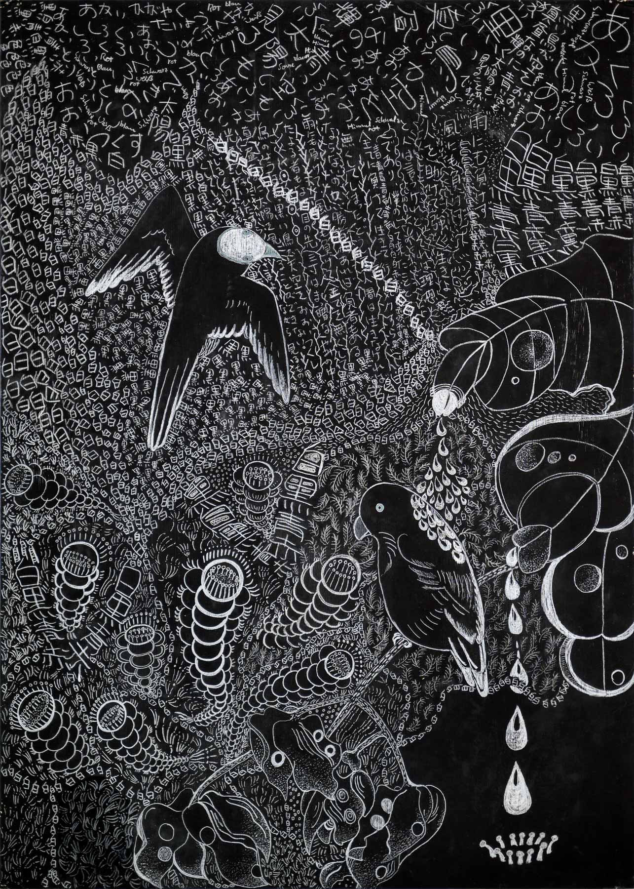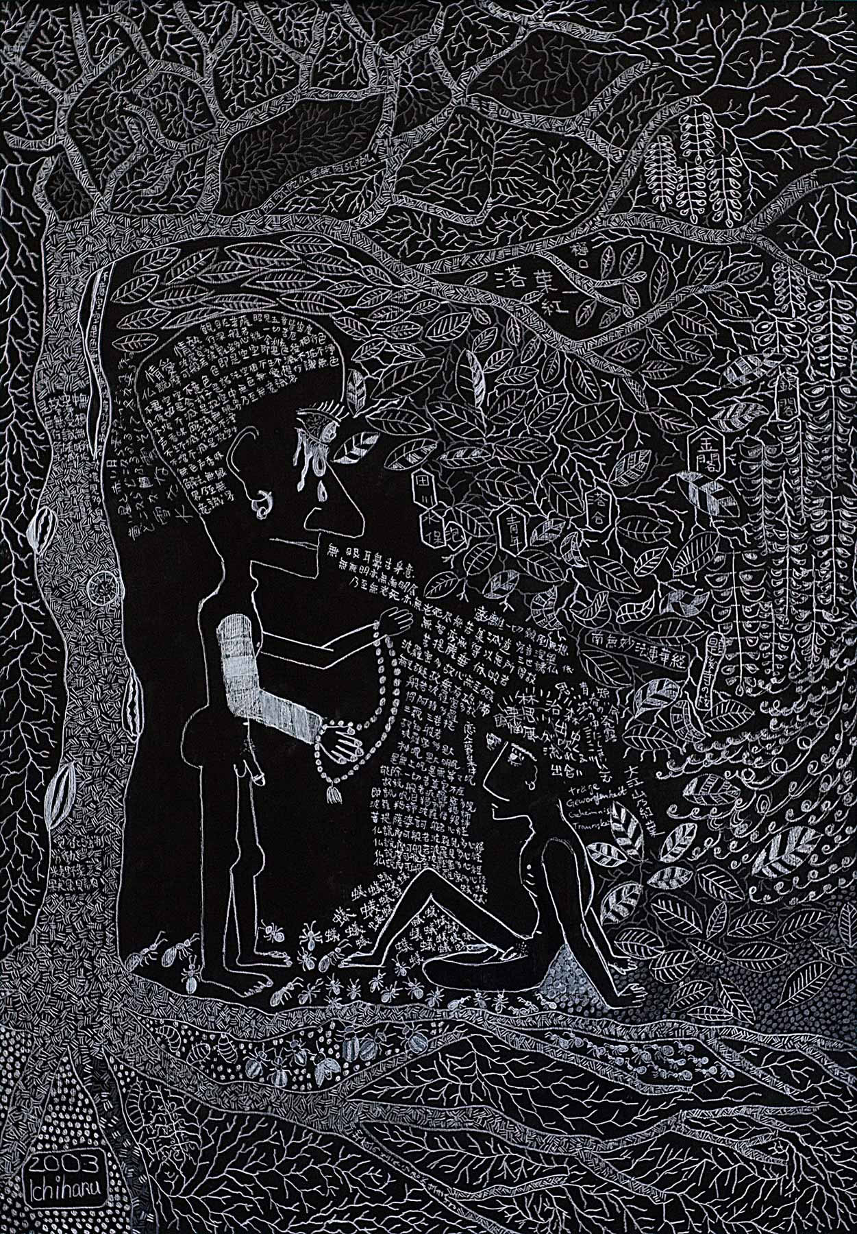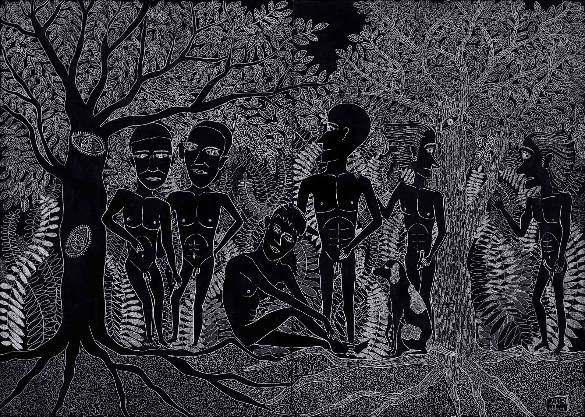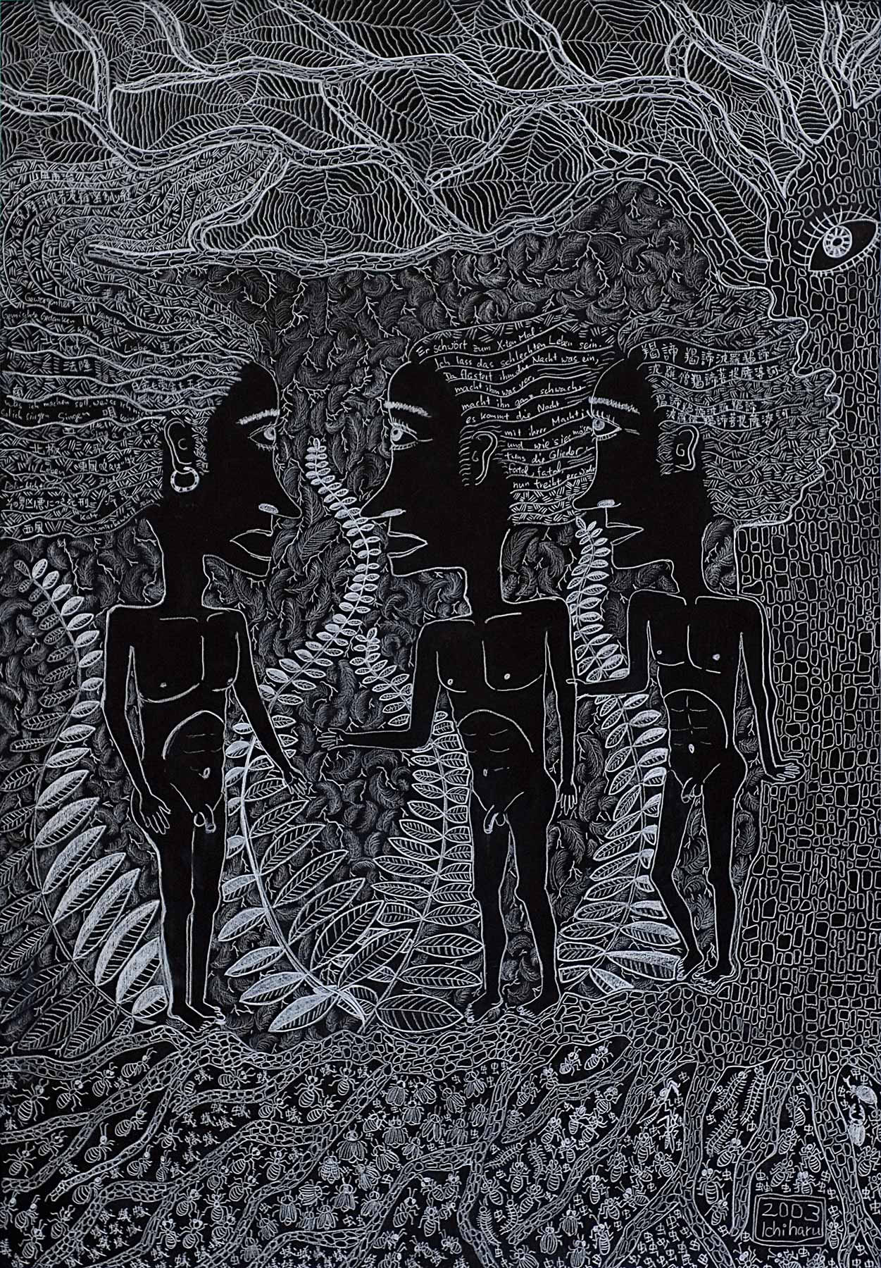 »...Ichiharu Yamada: vollendet gefüllte Formate. Und auch hier wieder Menschenkörper, Männerkörper. Das Geschlecht als schüchterne doch, präzise Klassifizierung. Die Männer inmitten einer Vegetation, die Henri Rousseaus Idyllen sehr ähnlich sind. Nur eben dass Rousseau die Farben liebte und Ichiharu Yamada die weiße Linie auf schwarzem Grund. Der Leib - humane Zierde - schält sich aus dem Ornament aus Wurzeln, Blüten und Blättern - Gravuren mit weißem Buntstift auf Graukarton. Sie sind wie Wucherungen auf dem Papier, ornamentales Wachstum, das für den Drang stehen mag, alles, wessen die zeichnende Hand habhaft wird, zu markieren, zu bezeichnen und mit einem rhythmischen Grundrauschen zu unterlegen...« Grit Weber