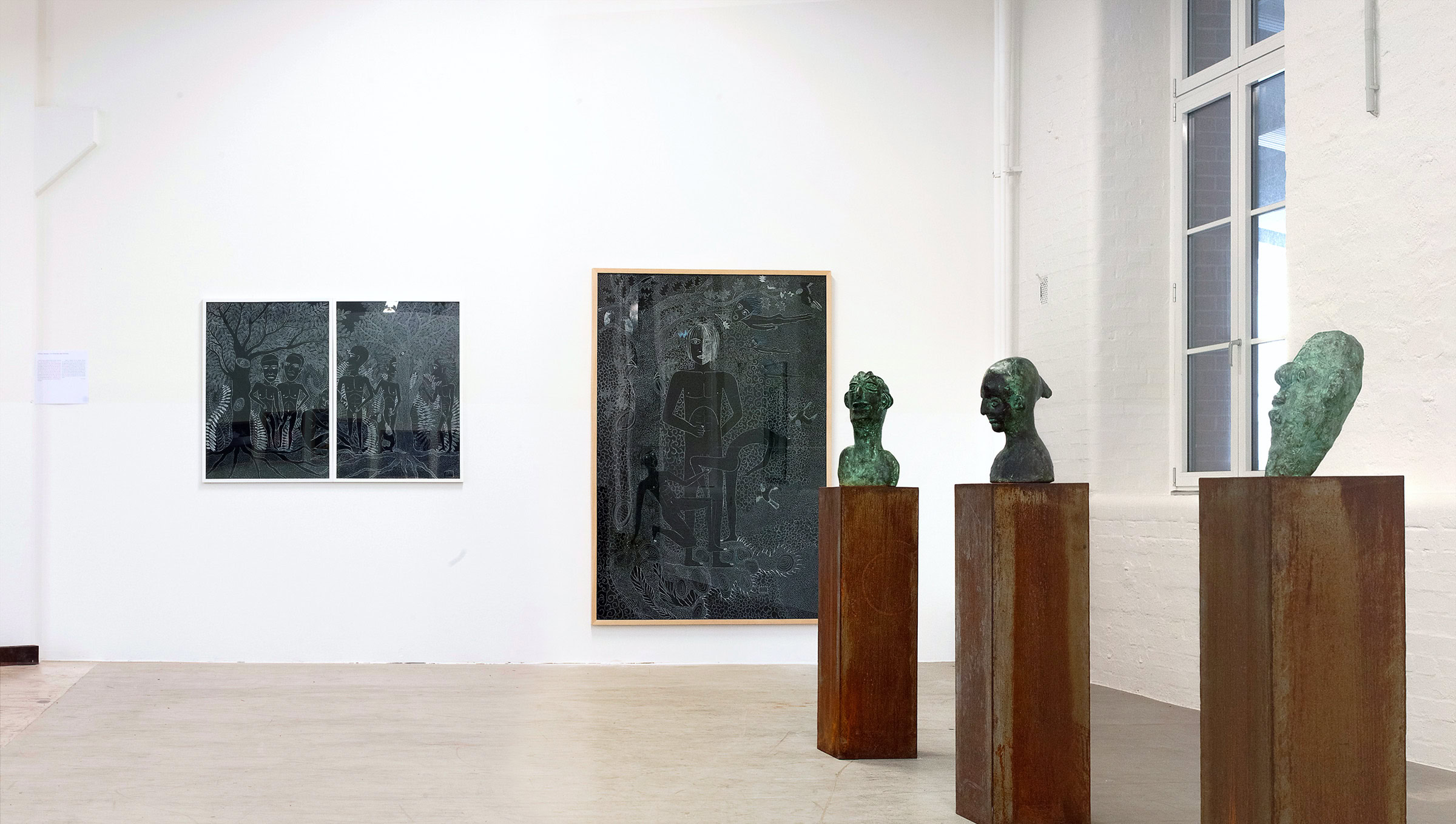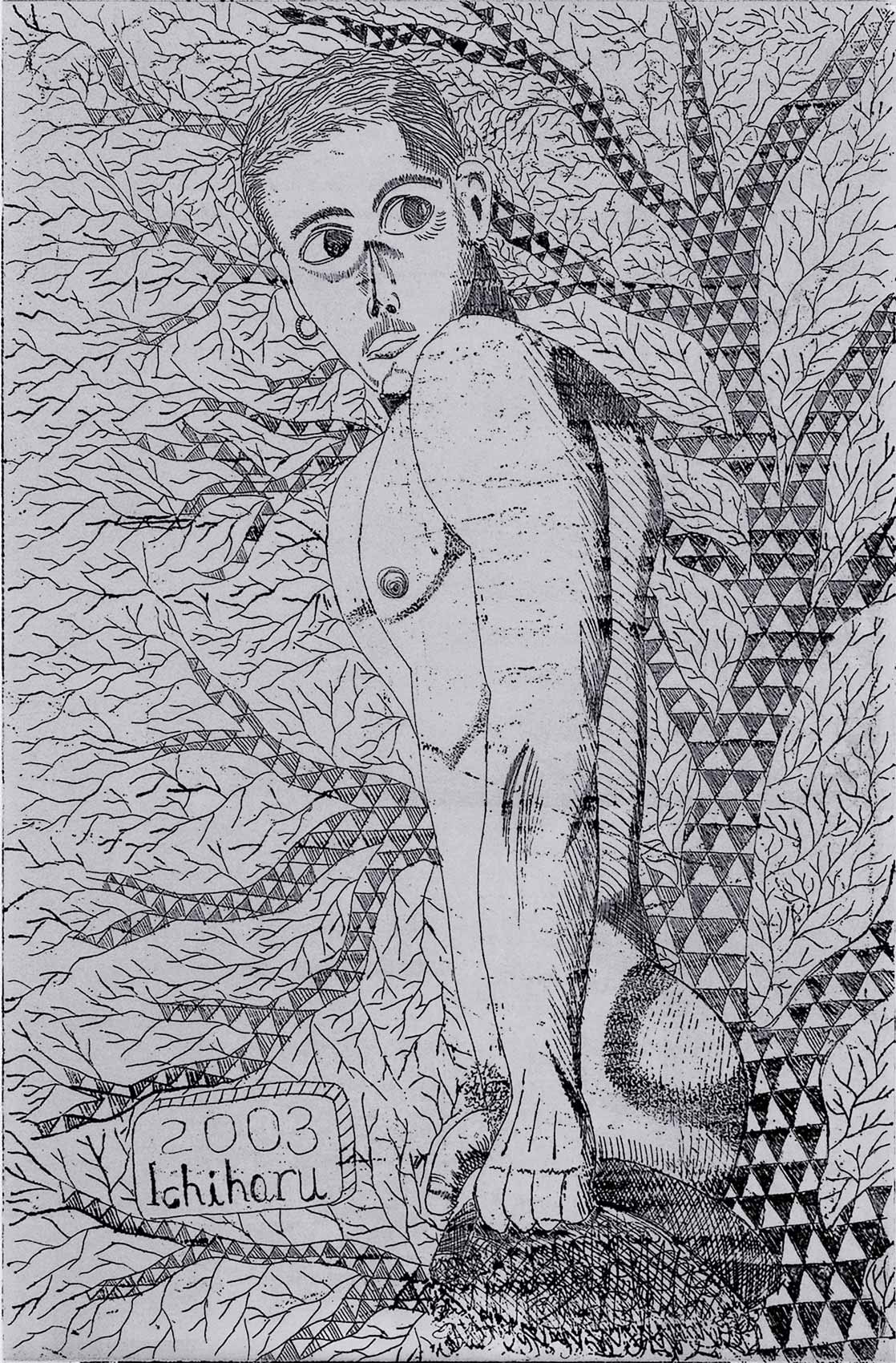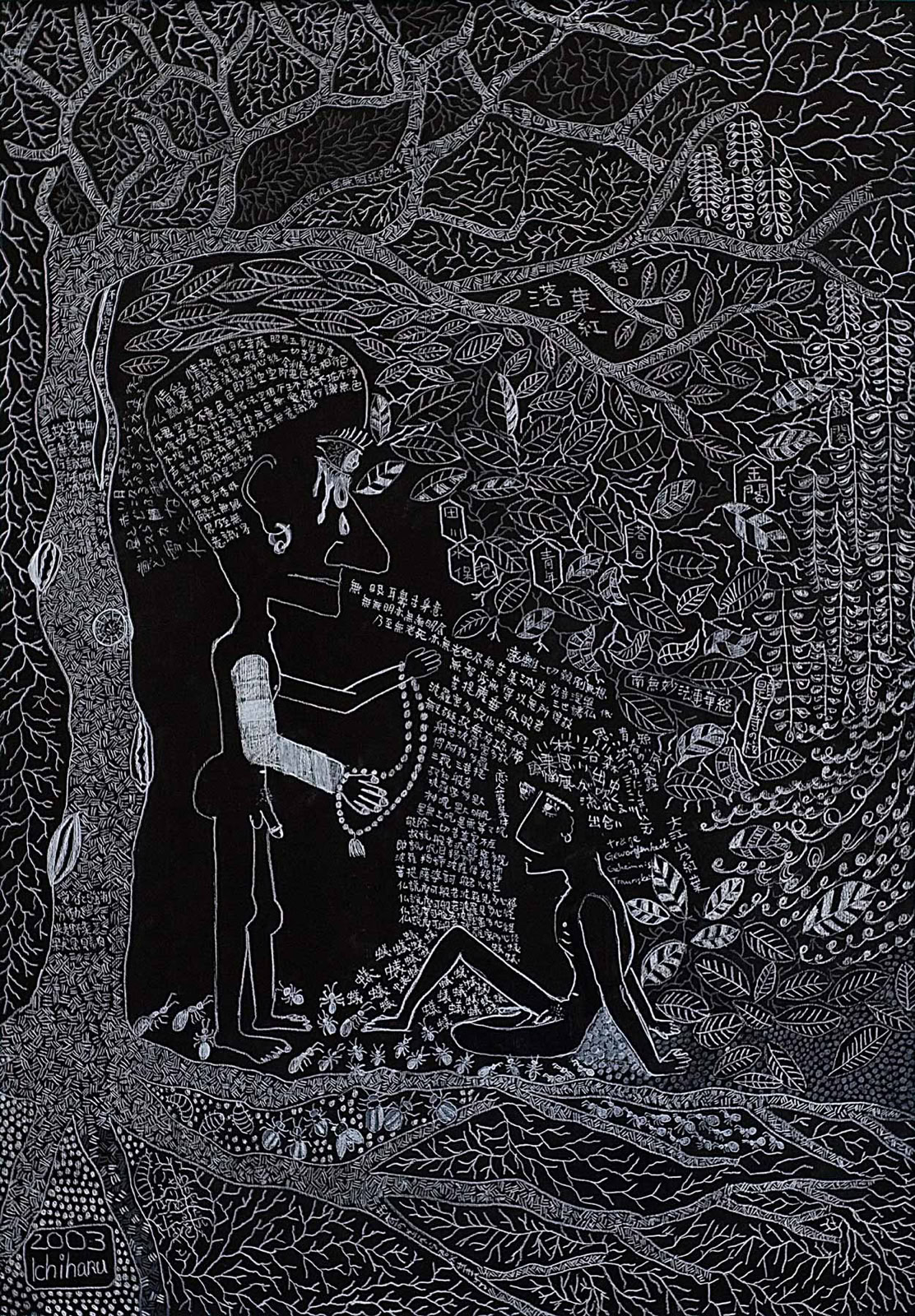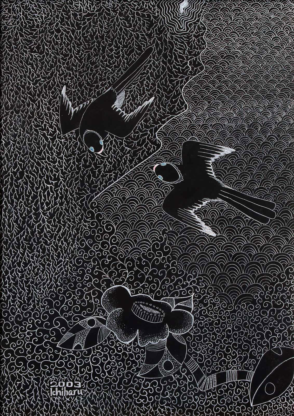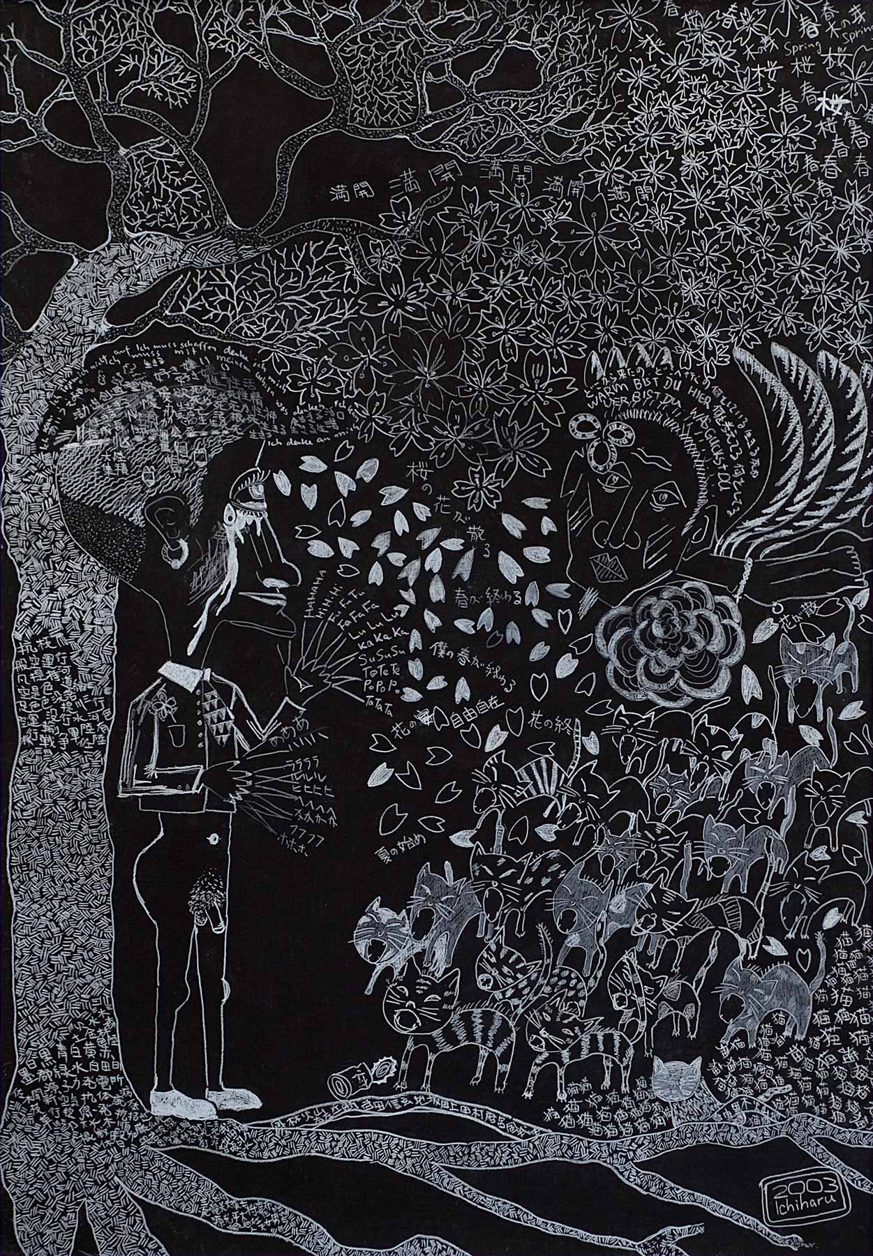 »...Ichiharu Yamada: vollendet gefüllte Formate. Und auch hier wieder Menschenkörper, Männerkörper. Das Geschlecht als schüchterne doch, präzise Klassifizierung. Die Männer inmitten einer Vegetation, die Henri Rousseaus Idyllen sehr ähnlich sind. Nur eben dass Rousseau die Farben liebte und Ichiharu Yamada die weiße Linie auf schwarzem Grund. Der Leib - humane Zierde - schält sich aus dem Ornament aus Wurzeln, Blüten und Blättern - Gravuren mit weißem Buntstift auf Graukarton. Sie sind wie Wucherungen auf dem Papier, ornamentales Wachstum, das für den Drang stehen mag, alles, wessen die zeichnende Hand habhaft wird, zu markieren, zu bezeichnen und mit einem rhythmischen Grundrauschen zu unterlegen...« Grit Weber