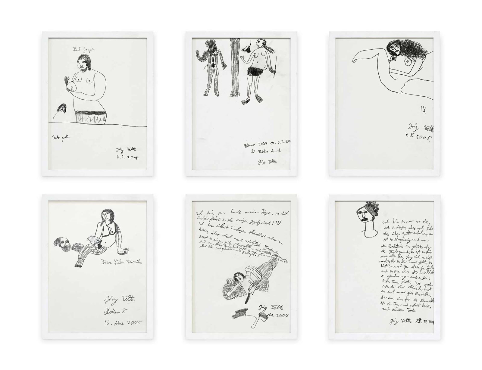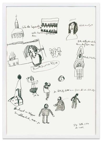 Seine Zeichnungen brauchten lange bis zu ihrer Fertigstellung. Immer wieder unterbrochen von Selbstgesprächen, von Bewegungsdrang. Sie entstanden spontan oder nach Abbildungen. Oft auch in Kombination. Immer wieder versah er sie mit eigenen Gedanken und Kommentaren. Bisweilen führten die ergänzenden Texte ein Eigenleben. Sie wurden neben einer kleinen Zeichnung übermächtig und füllen das ganze Blatt: Zeichenfragmente in neuer Synthese mit Textfragmenten.
