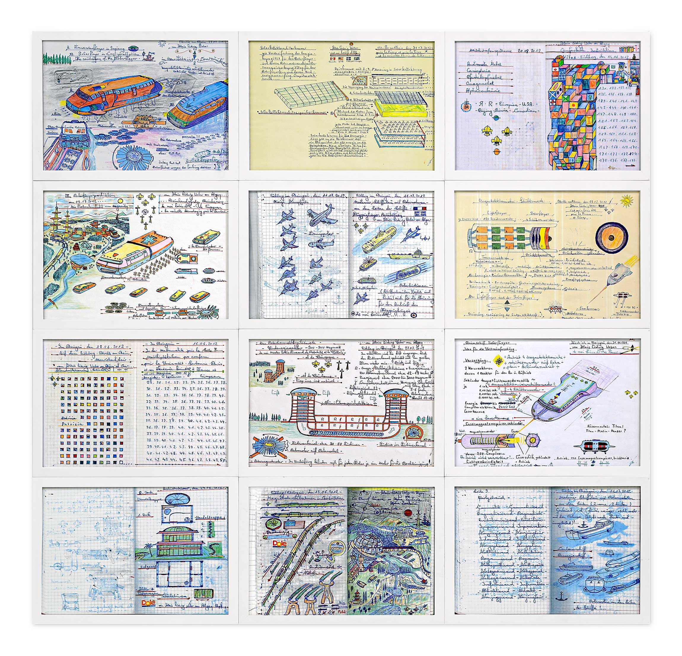 Viele Institutionen hat Klaus Ludwig Weber angeschrieben. Nicht immer hat er, wie aus dem Bundeskanzleramt, eine Antwort erhalten. Seine „Zeichnungen aus naturwissenschaftlichen Studien“ sind primär nicht als ästhetische Gebilde zu verstehen, sie dienen vielmehr der Visualisierung, der Klärung und dem Transport seiner Ideen und Entwicklungen. Auf ihnen befinden sich Notizen, Erläuterungen und Berechnungen zu zukunftsträchtigen Erfindungen.