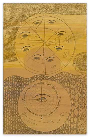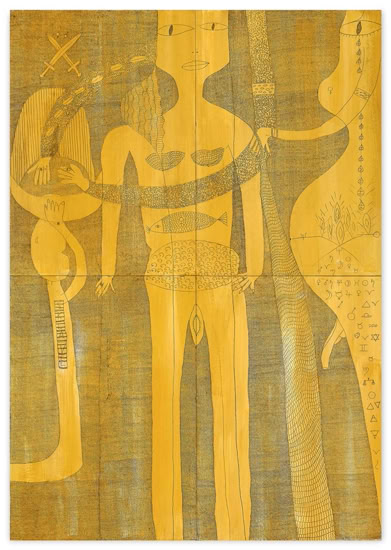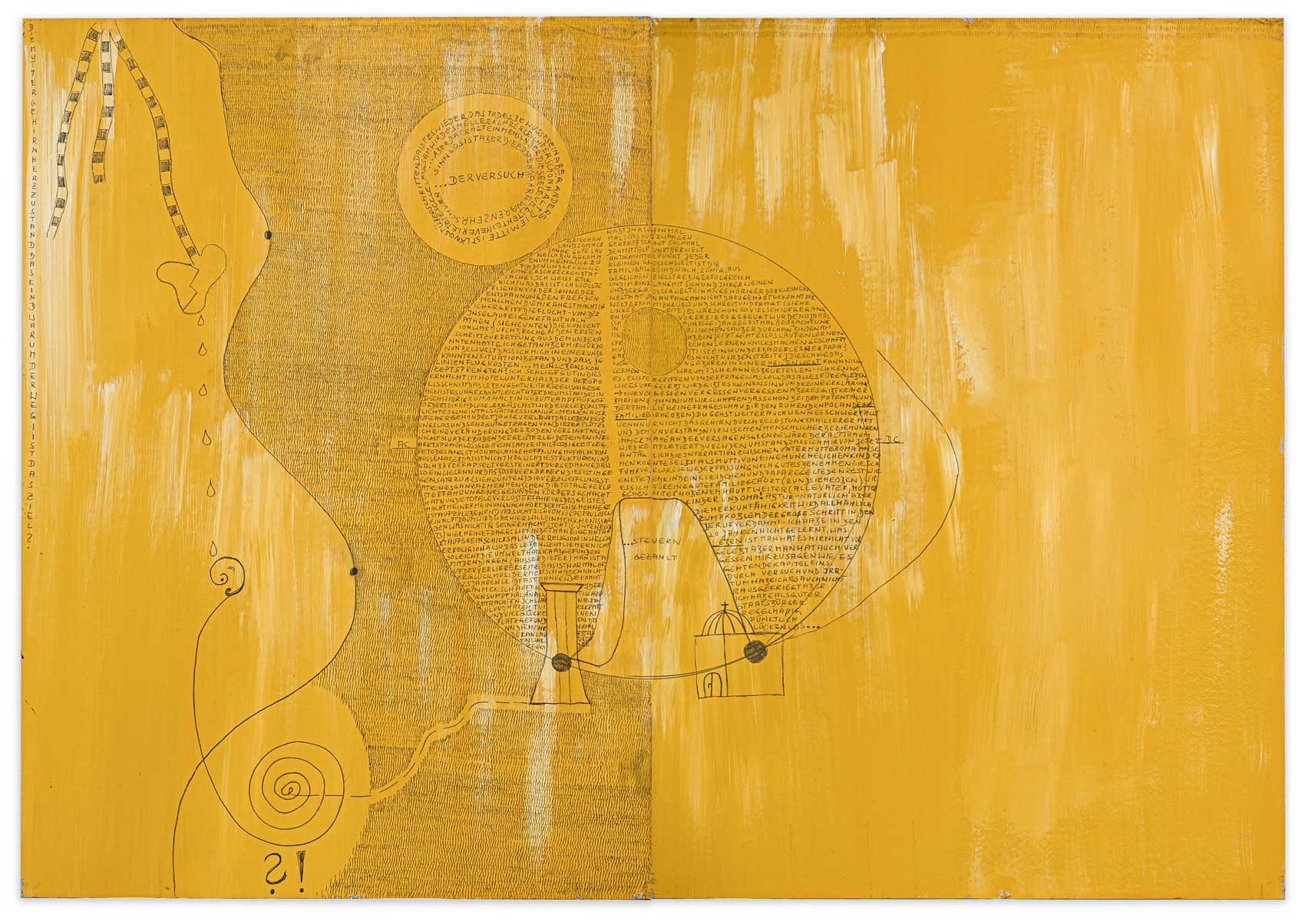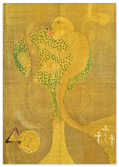 mit männlichem Geschlecht. Sie ist kopflos dargestellt, das Feuer in ihrem Bauch können auch die Tränen des in der Schulter positionier- ten Auges nicht löschen. Links trägt der Sklave bereits die Schale mit dem Haupt Johannes des Täufers. Wie aus Salomes rechter Hand gefallen, liest man daneben die Begriffe: Weltgeschichte, Wahrheit, Liebe, Krankheit, Geschlecht, Kinder, Leben, Klarheit.