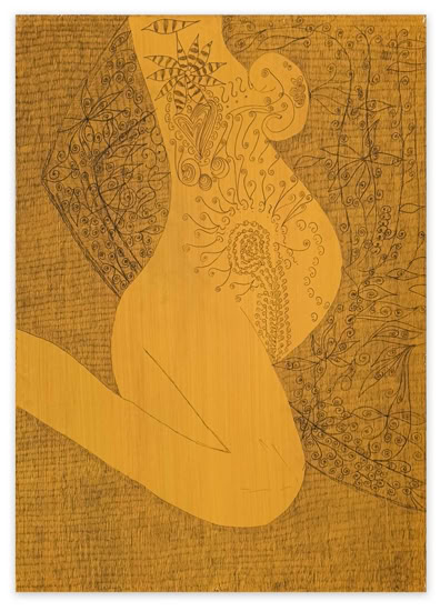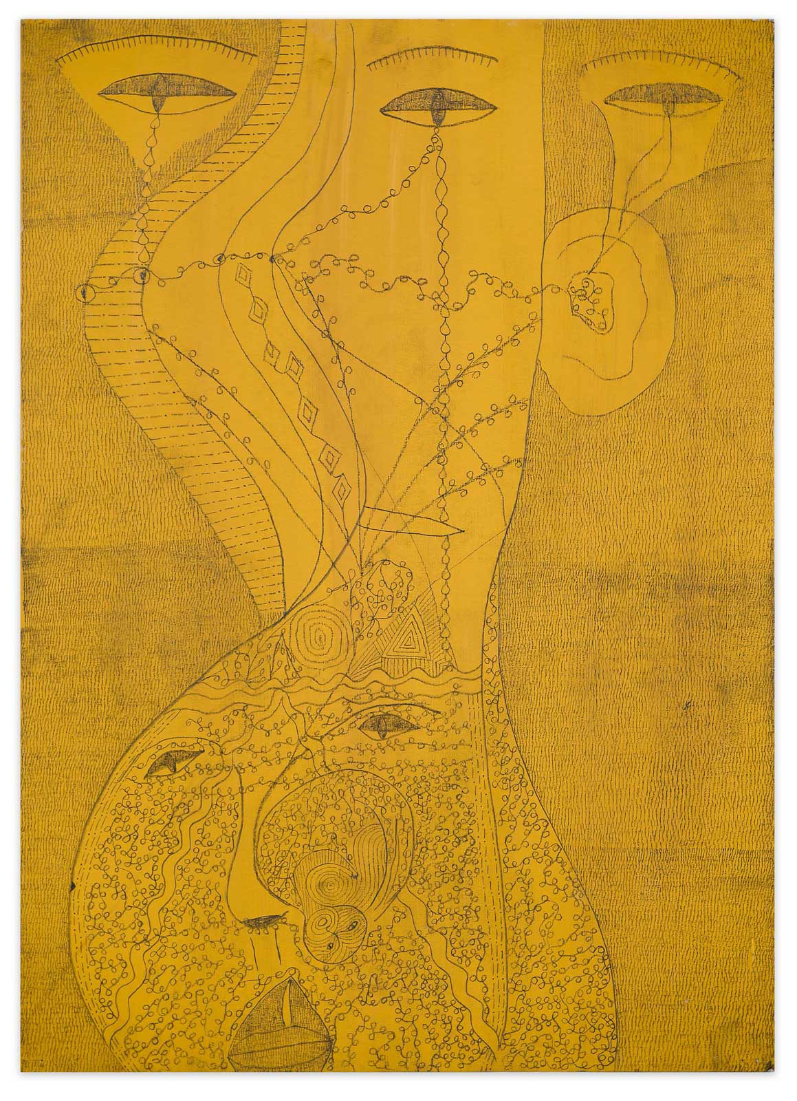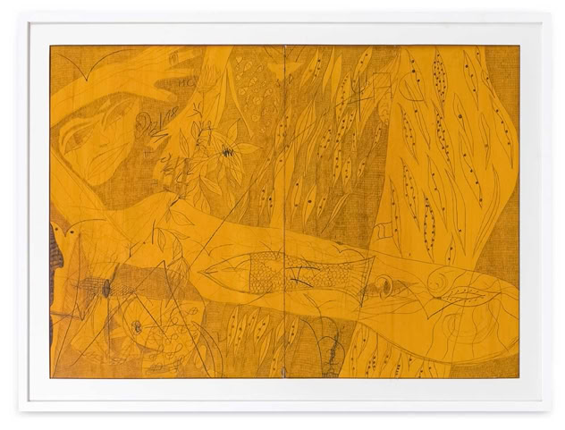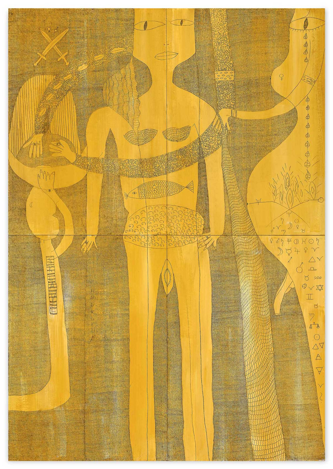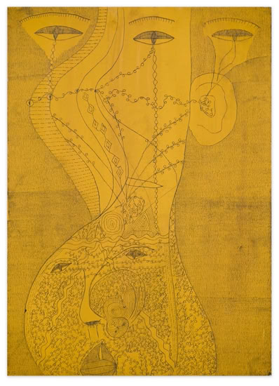 Zunächst fällt die ungewöhnliche Größe der feingliedrigen Zeichnung auf. Überlebensgroß schälen sich die Figuren aus einem Strich für Strich gearbeiteten Hintergrund. Zentral in der Mitte des Bildes die bereits entschleierte Salome mit weit geöffnetem Geschlecht und einem Fisch im Bauch, aus übergroßen Augen schaut sie den Betrach- ter ungerührt an, rechts die Verführerin Herodias als schwangere Frau